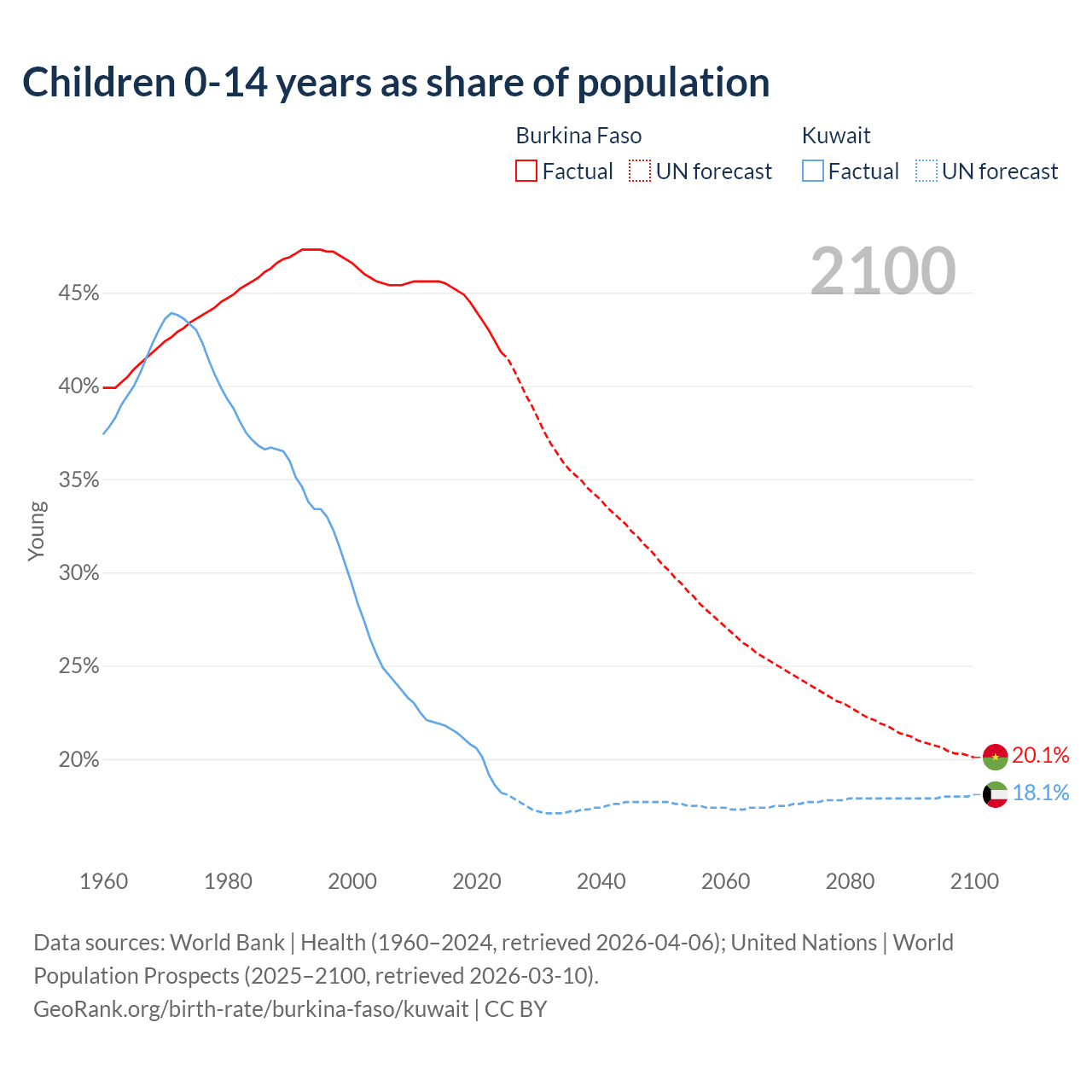 Burkina Faso has an annual birth rate of 31.6 births per 1,000 people, compared to 10.3 for Kuwait. The average number of children a woman is expected to have during her lifetime — the fertility rate, is 4.19 in Burkina Faso and 1.52 in Kuwait — 63.6% difference.