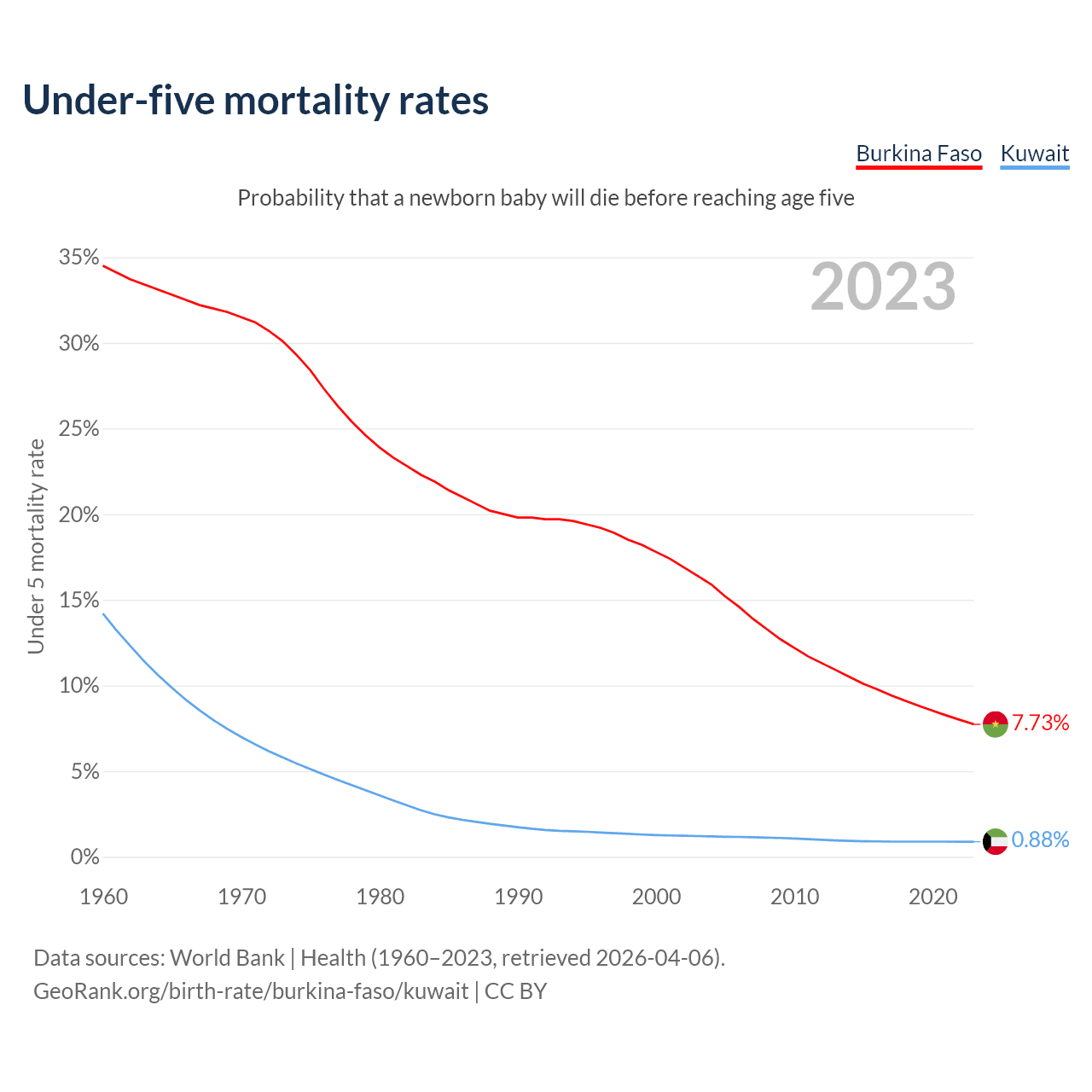 The chance that a newborn baby will die before reaching age five is 7.73% in Burkina Faso and 0.88% in Kuwait. Above is a chart with historical data on under-five mortality rates.