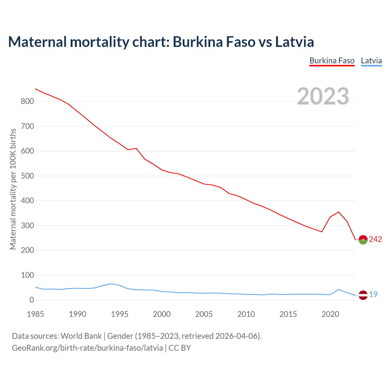The maternal mortality rate, which is the probability of dying during childbirth or within 42 days of pregnancy termination, is 242 deaths per 100,000 live births in Burkina Faso, compared to 19 deaths in Latvia.