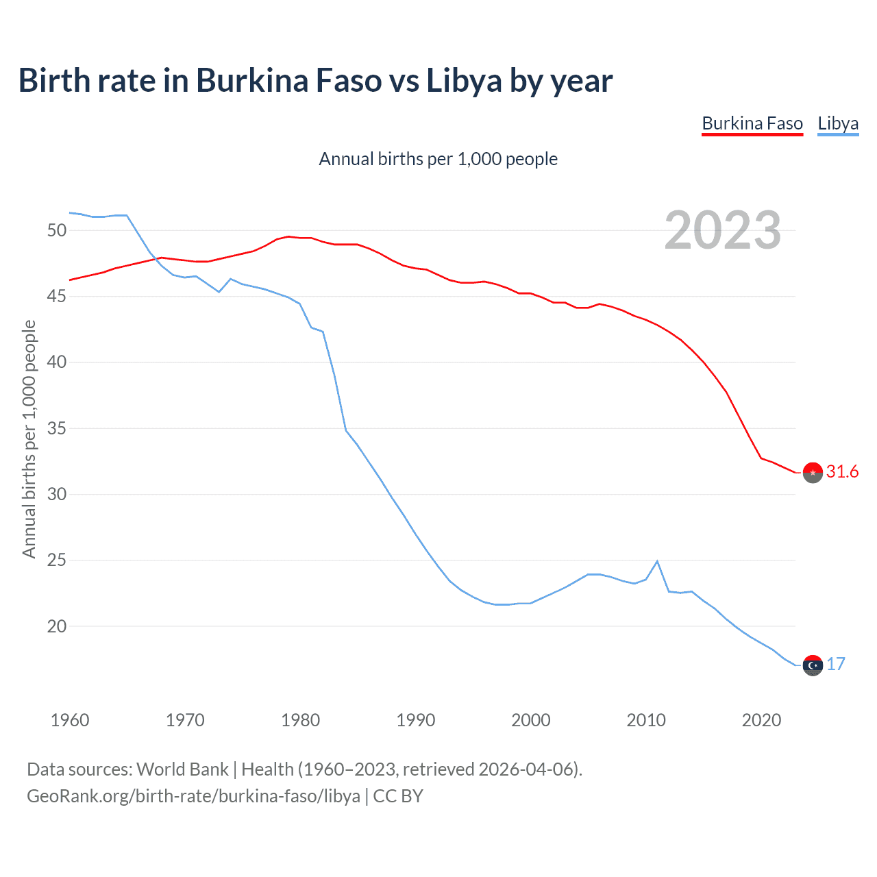 Burkina Faso has an annual birth rate of 31.6 births per 1,000 people, compared to 17 for Libya. The average number of children a woman is expected to have during her lifetime — the fertility rate, is 4.19 in Burkina Faso and 2.36 in Libya — 43.7% difference.