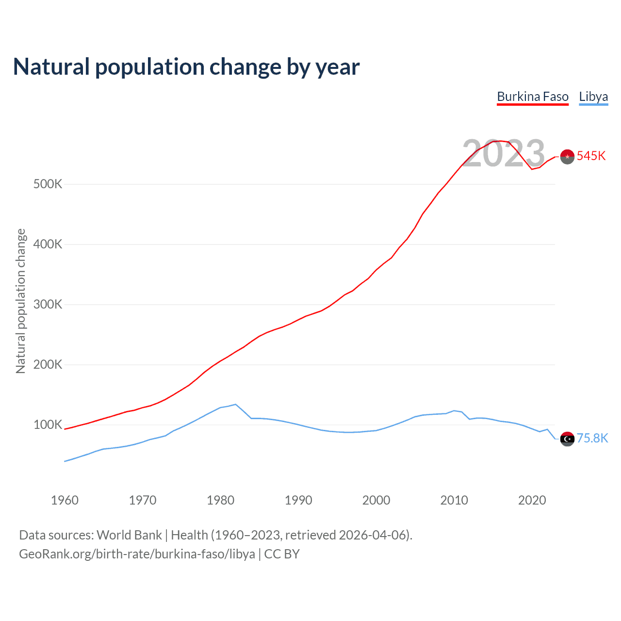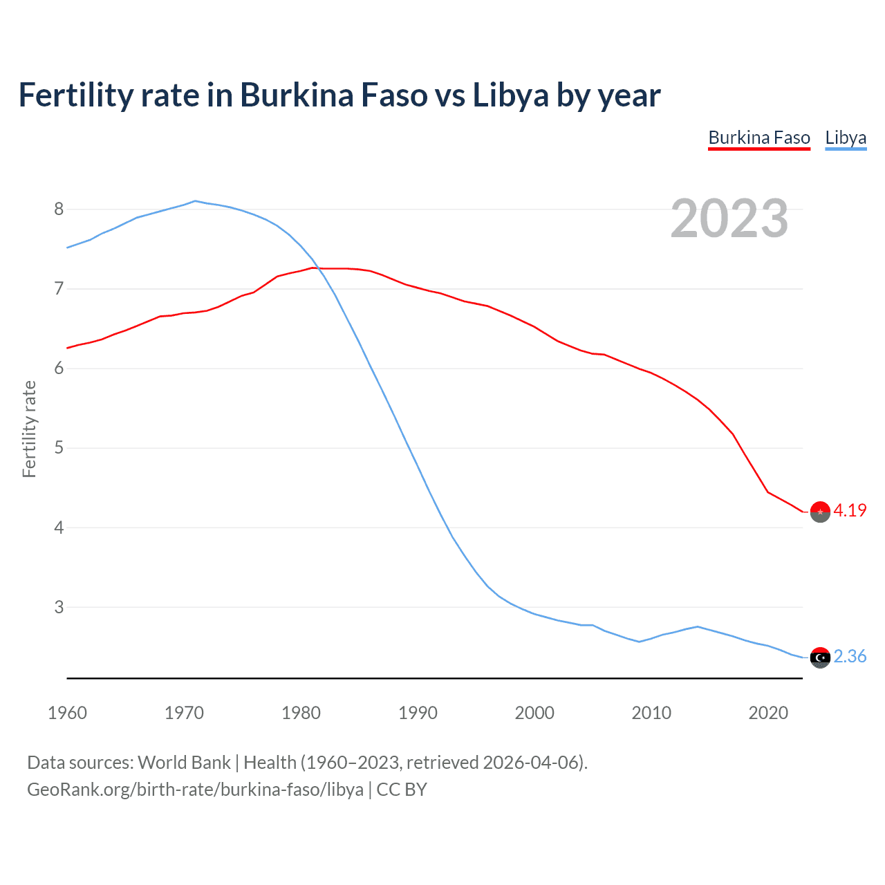 According to the latest available data on birth rates, the fertility rate in Burkina Faso was 4.19 children per woman in 2023, compared to 2.36 in Libya in 2023. The replacement level is considered to be 2.1 children per woman.