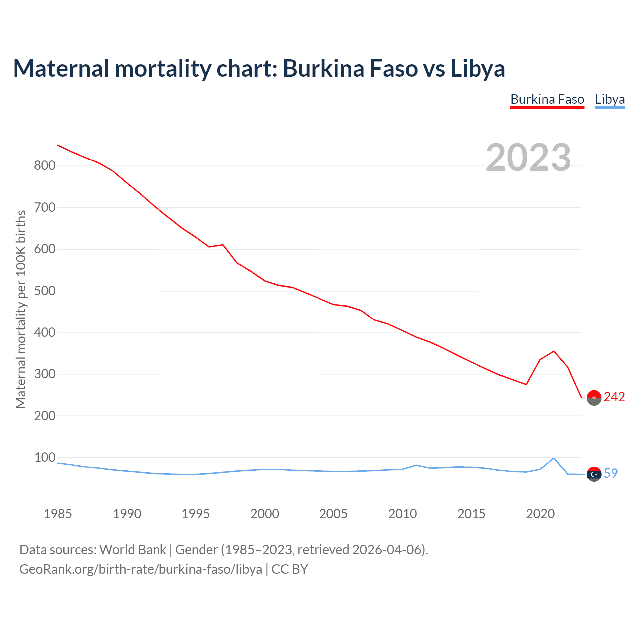 - Annual births per 1,000 women ages 15-19 (adolescent birth rate or teenage mother rate) is 87.1 in Burkina Faso vs 5.92 in Libya.