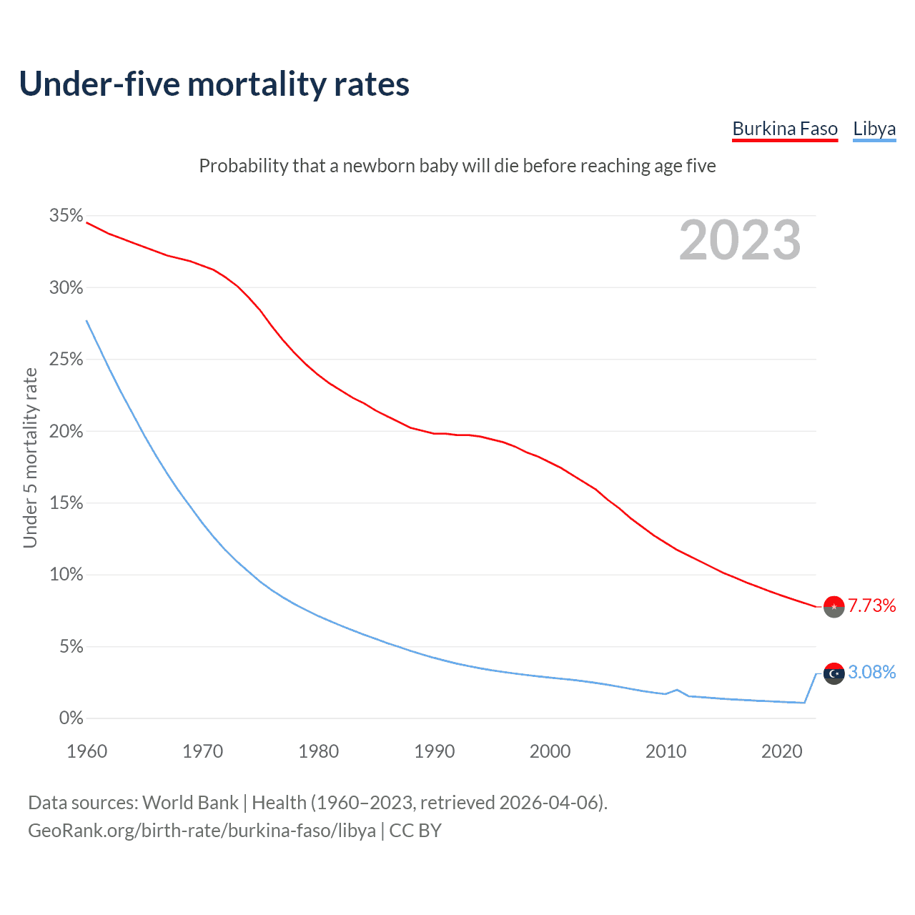 The chance that a newborn baby will die before reaching age five is 7.73% in Burkina Faso and 3.08% in Libya. Above is a chart with historical data on under-five mortality rates.