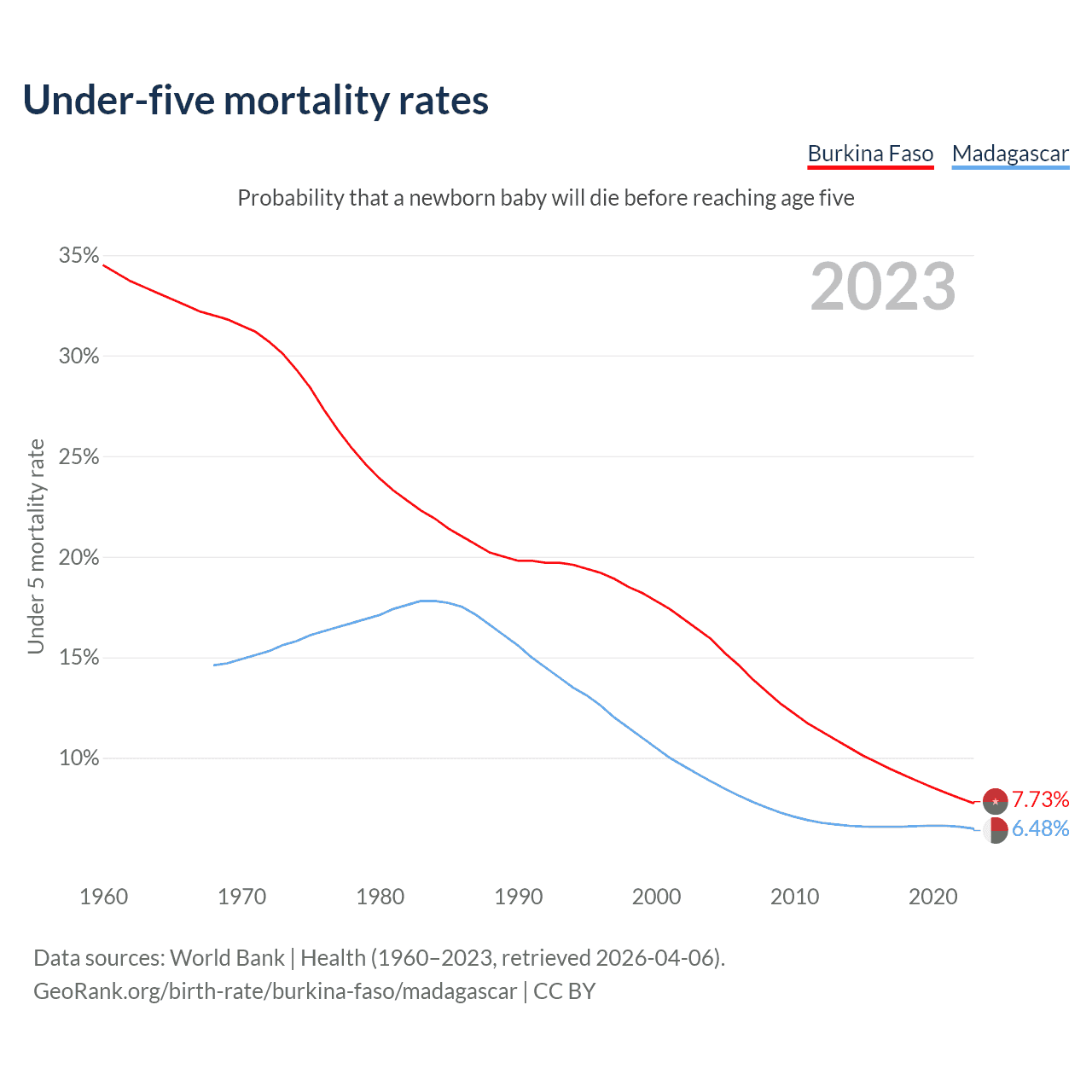 The chance that a newborn baby will die before reaching age five is 7.73% in Burkina Faso and 6.48% in Madagascar. Above is a chart with historical data on under-five mortality rates.
