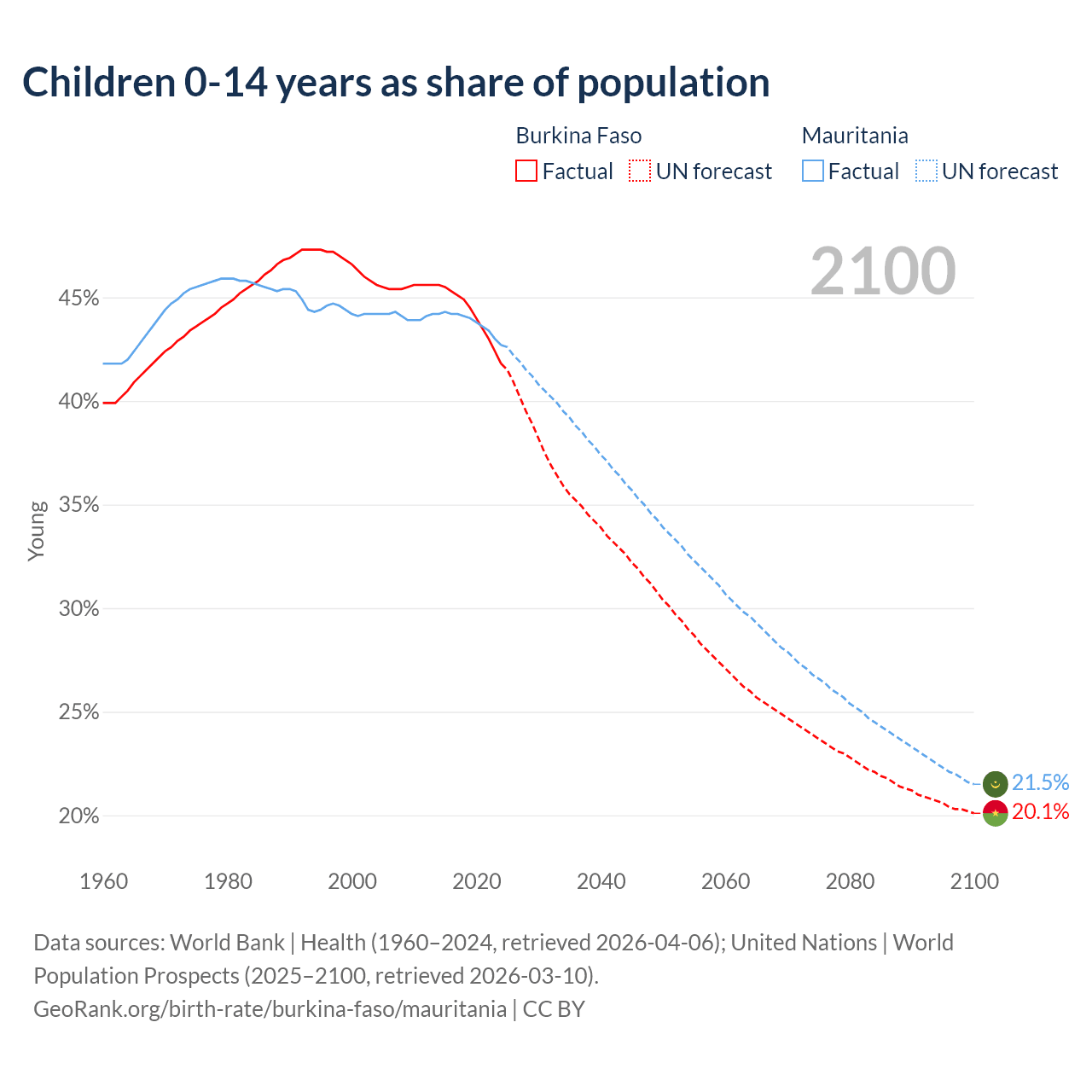 According to the latest available data on birth rates, the fertility rate in Burkina Faso was 4.19 children per woman in 2023, compared to 4.7 in Mauritania in 2023. The replacement level is considered to be 2.1 children per woman.