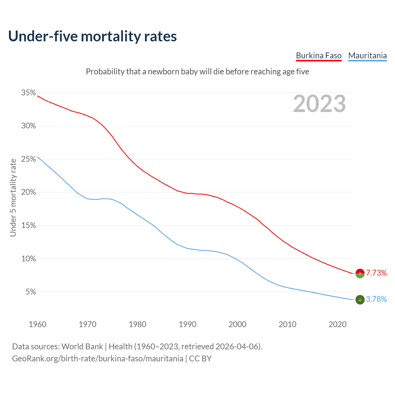 The chance that a newborn baby will die before reaching age five is 7.73% in Burkina Faso and 3.78% in Mauritania. Above is a chart with historical data on under-five mortality rates.