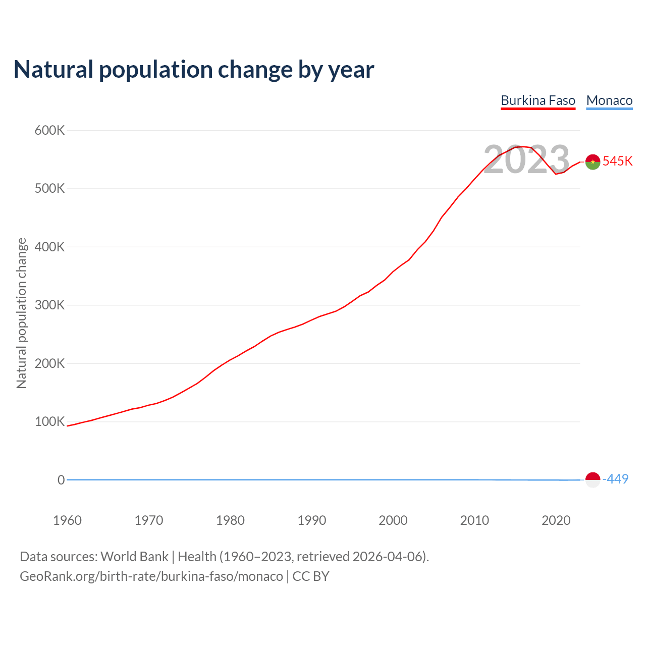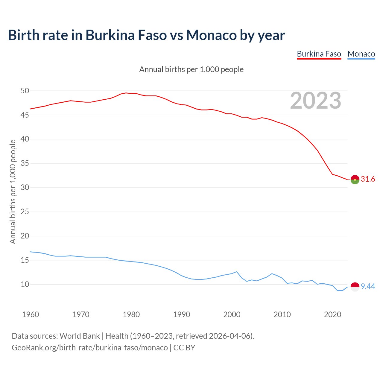 Burkina Faso has an annual birth rate of 31.6 births per 1,000 people, compared to 9.44 for Monaco. The average number of children a woman is expected to have during her lifetime — the fertility rate, is 4.19 in Burkina Faso and 2.11 in Monaco — 49.6% difference.