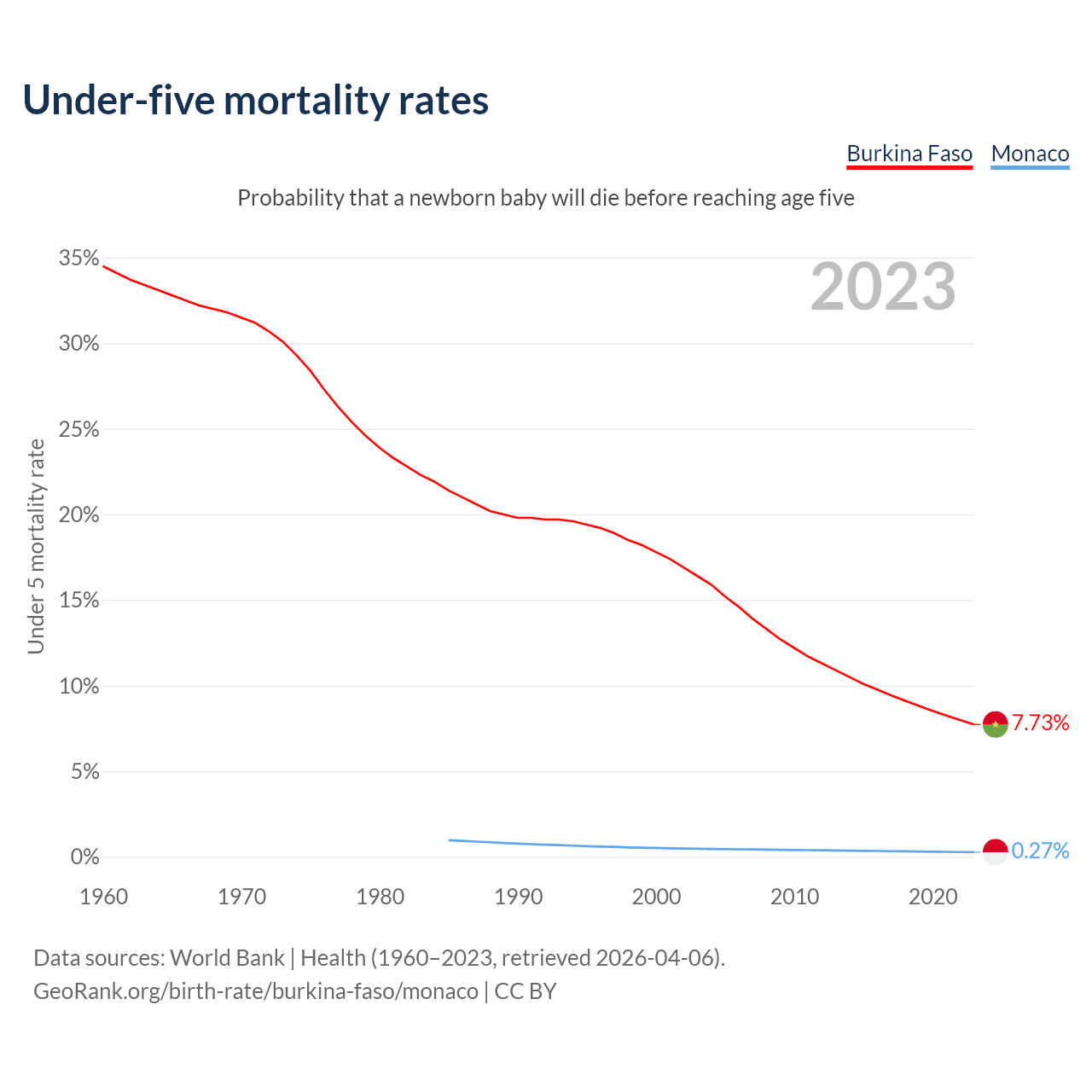 The chance that a newborn baby will die before reaching age five is 7.73% in Burkina Faso and 0.27% in Monaco. Above is a chart with historical data on under-five mortality rates.