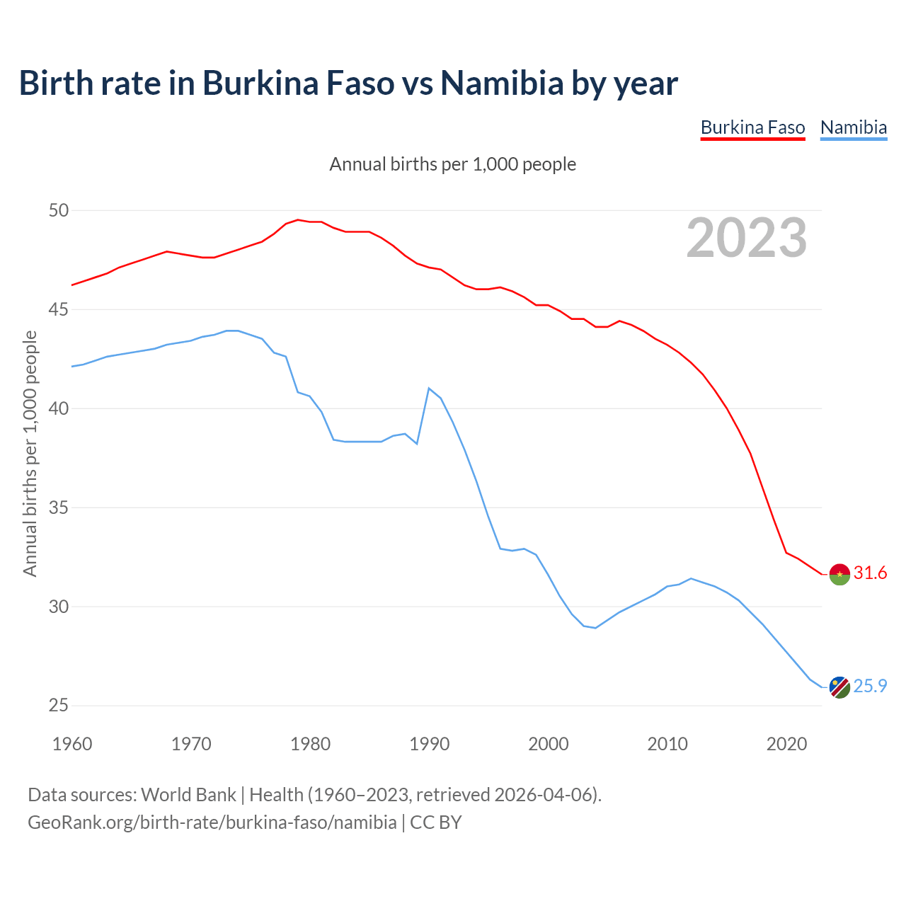 Burkina Faso has an annual birth rate of 31.6 births per 1,000 people, compared to 25.9 for Namibia. The average number of children a woman is expected to have during her lifetime — the fertility rate, is 4.19 in Burkina Faso and 3.21 in Namibia — 23.3% difference.