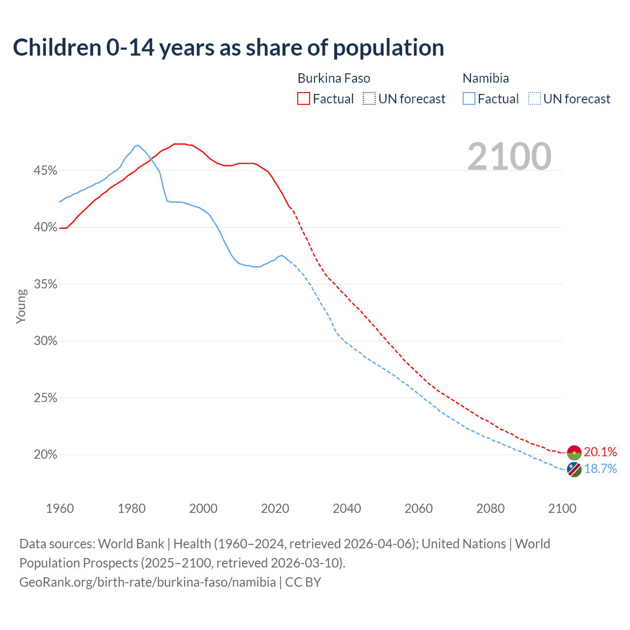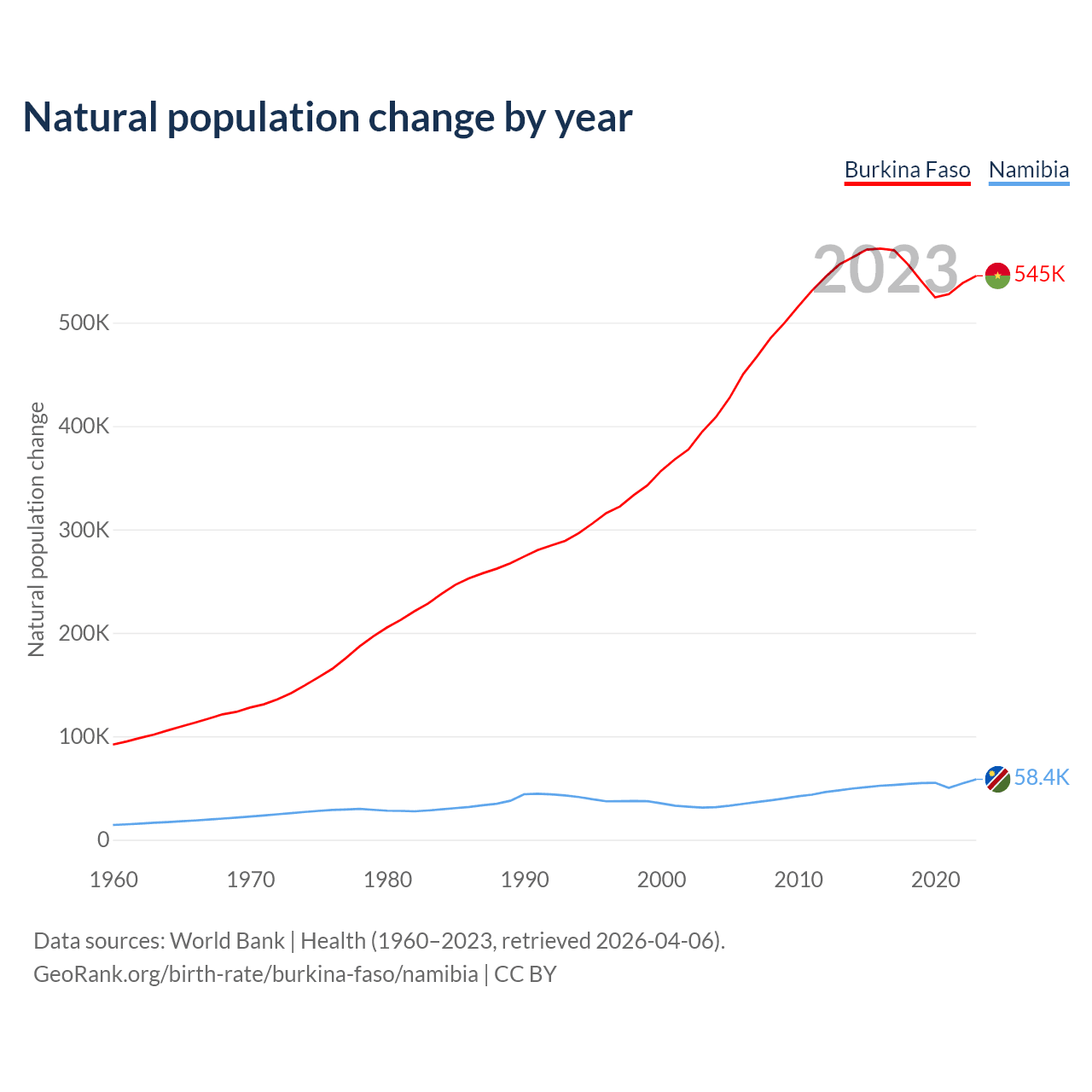 According to the latest available data on birth rates, the fertility rate in Burkina Faso was 4.19 children per woman in 2023, compared to 3.21 in Namibia in 2023. The replacement level is considered to be 2.1 children per woman.