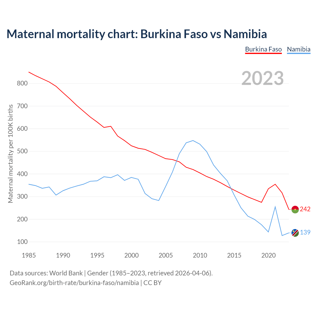 The maternal mortality rate, which is the probability of dying during childbirth or within 42 days of pregnancy termination, is 242 deaths per 100,000 live births in Burkina Faso, compared to 139 deaths in Namibia.