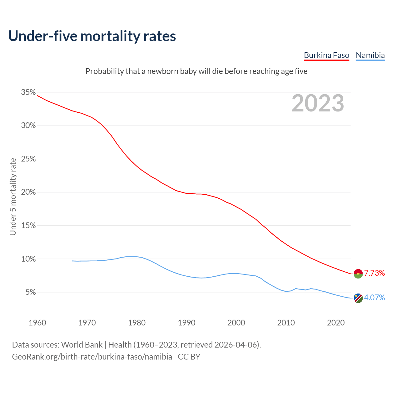 The chance that a newborn baby will die before reaching age five is 7.73% in Burkina Faso and 4.07% in Namibia. Above is a chart with historical data on under-five mortality rates.
