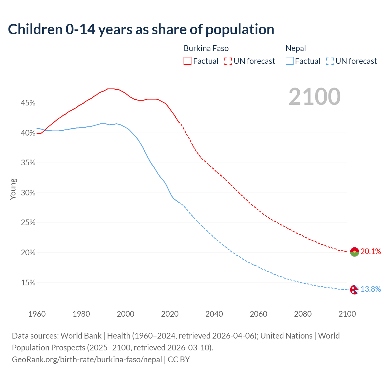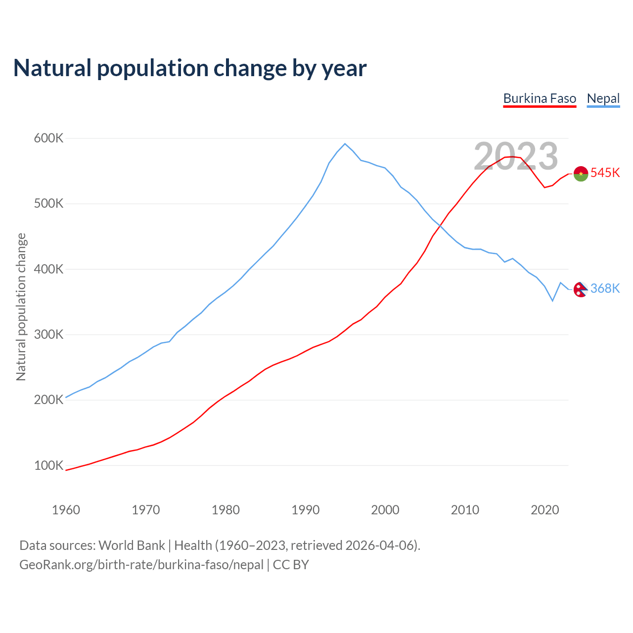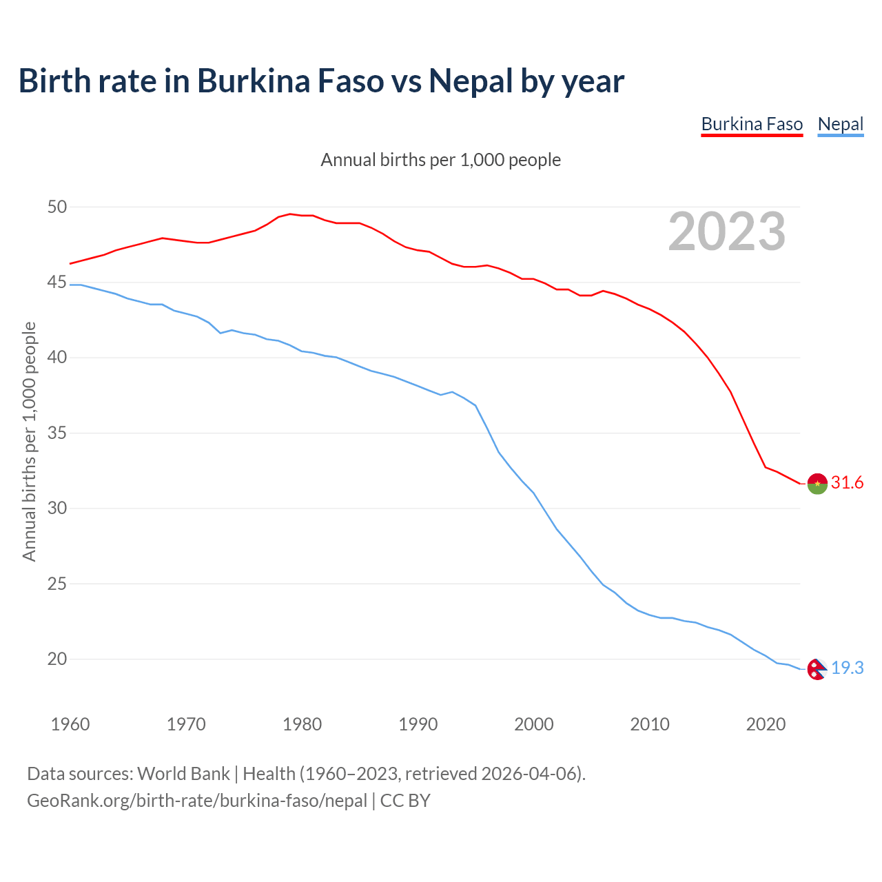 Burkina Faso has an annual birth rate of 31.6 births per 1,000 people, compared to 19.3 for Nepal. The average number of children a woman is expected to have during her lifetime — the fertility rate, is 4.19 in Burkina Faso and 1.98 in Nepal — 52.6% difference.
