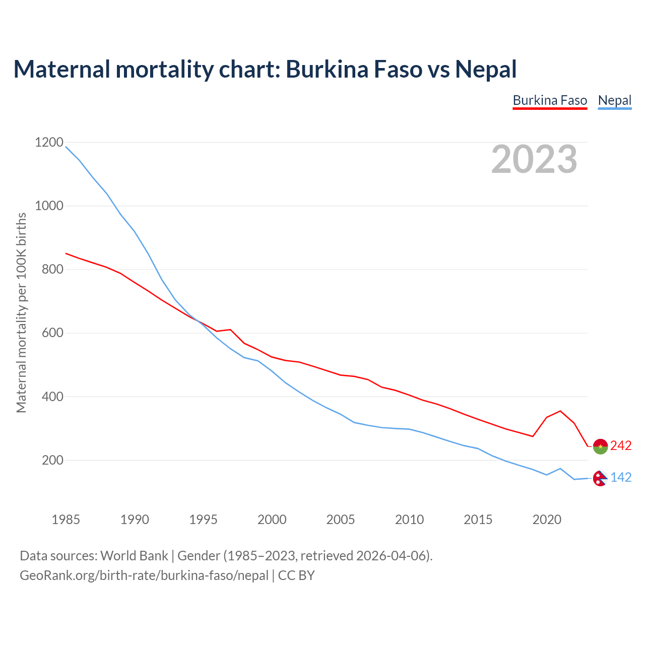 The maternal mortality rate, which is the probability of dying during childbirth or within 42 days of pregnancy termination, is 242 deaths per 100,000 live births in Burkina Faso, compared to 142 deaths in Nepal.