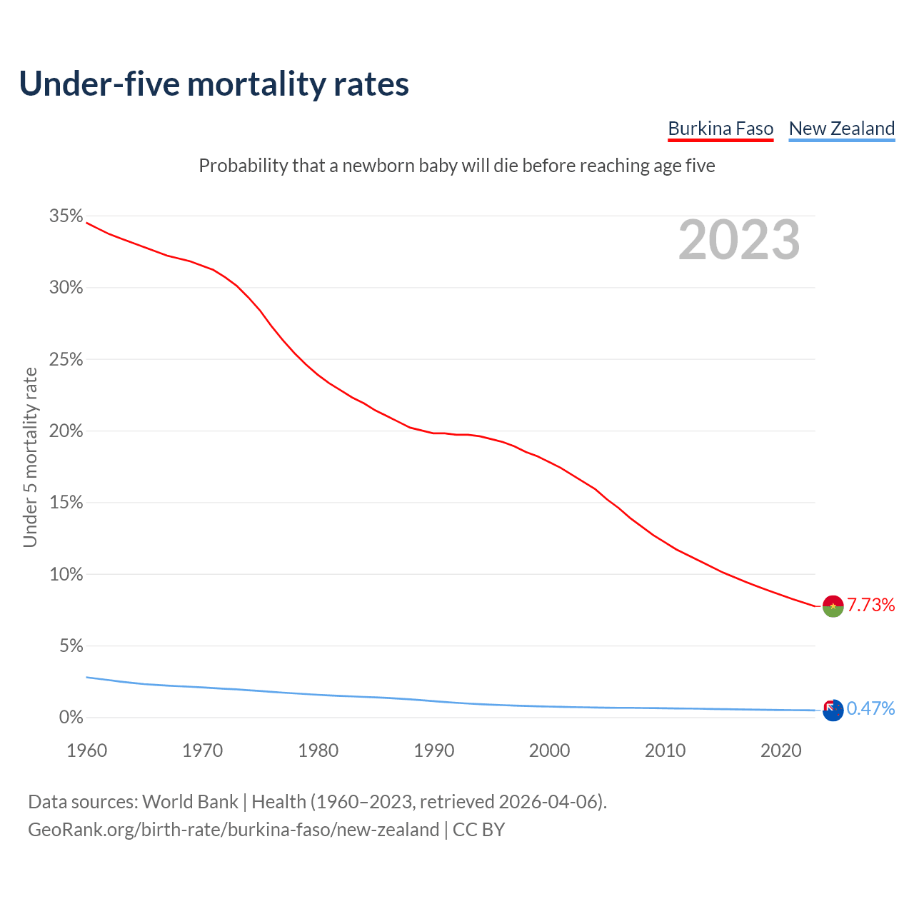 The chance that a newborn baby will die before reaching age five is 7.73% in Burkina Faso and 0.47% in New Zealand. Above is a chart with historical data on under-five mortality rates.