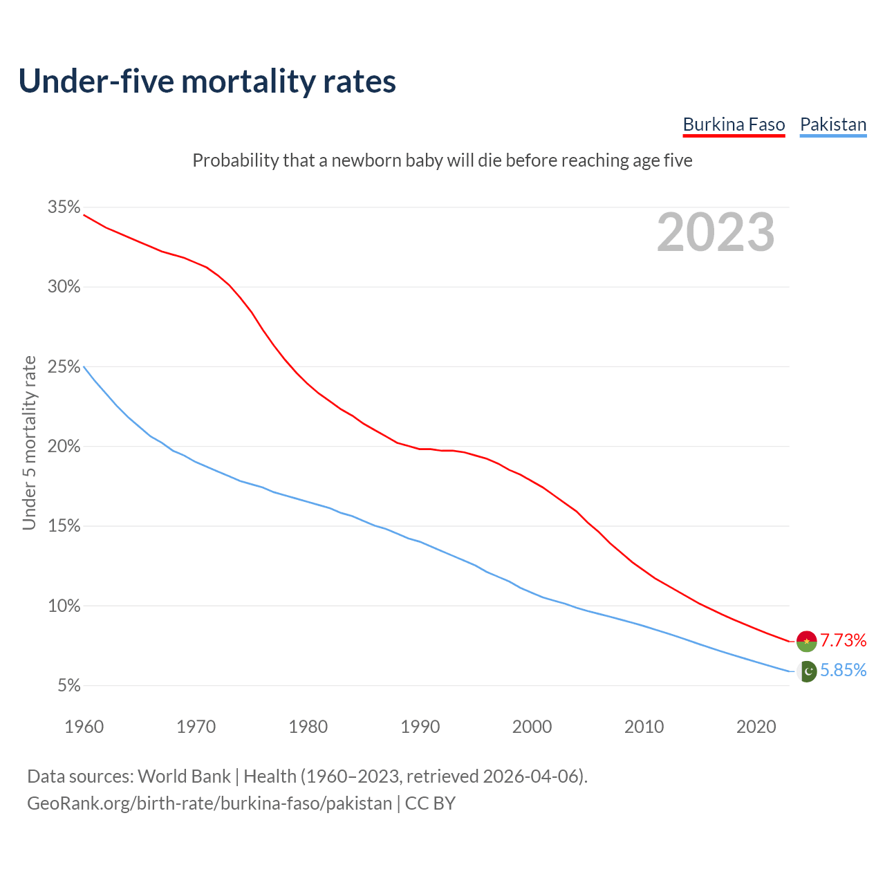 The chance that a newborn baby will die before reaching age five is 7.73% in Burkina Faso and 5.85% in Pakistan. Above is a chart with historical data on under-five mortality rates.