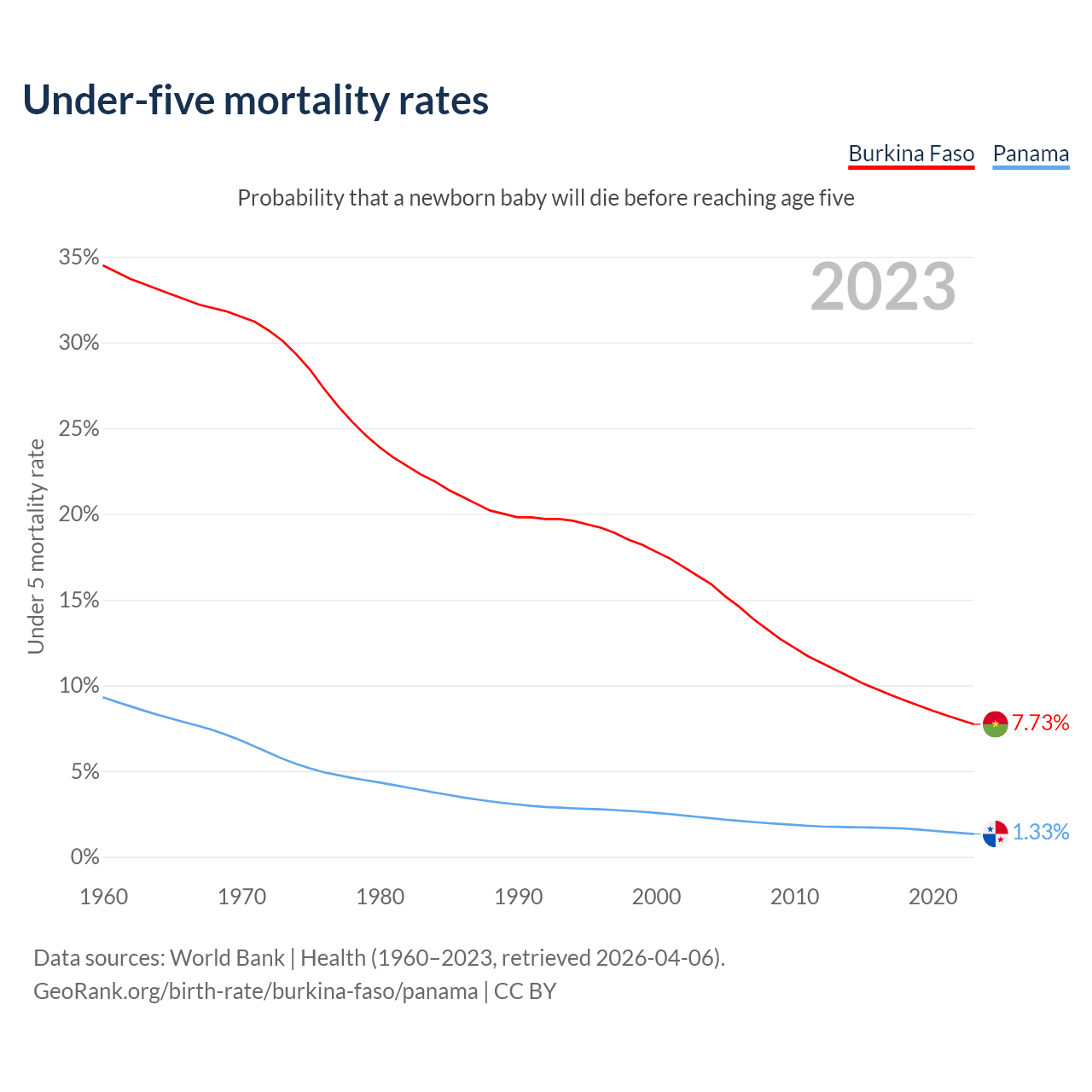The chance that a newborn baby will die before reaching age five is 7.73% in Burkina Faso and 1.33% in Panama. Above is a chart with historical data on under-five mortality rates.