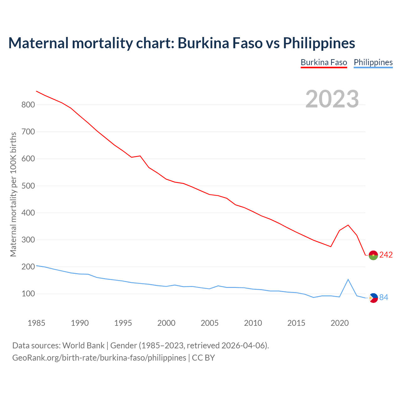 The maternal mortality rate, which is the probability of dying during childbirth or within 42 days of pregnancy termination, is 242 deaths per 100,000 live births in Burkina Faso, compared to 84 deaths in the Philippines.