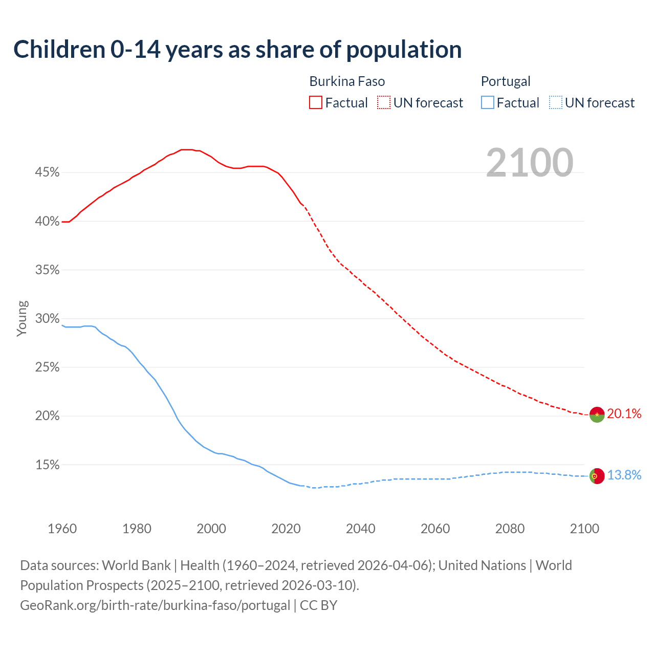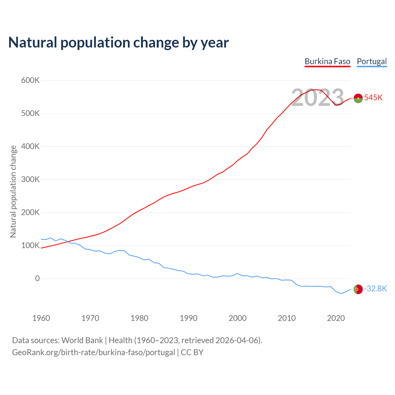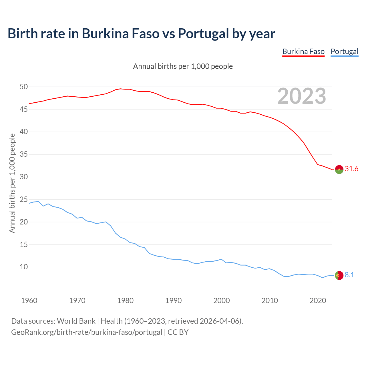 Burkina Faso has an annual birth rate of 31.6 births per 1,000 people, compared to 8.1 for Portugal. The average number of children a woman is expected to have during her lifetime — the fertility rate, is 4.19 in Burkina Faso and 1.44 in Portugal — 65.6% difference.
