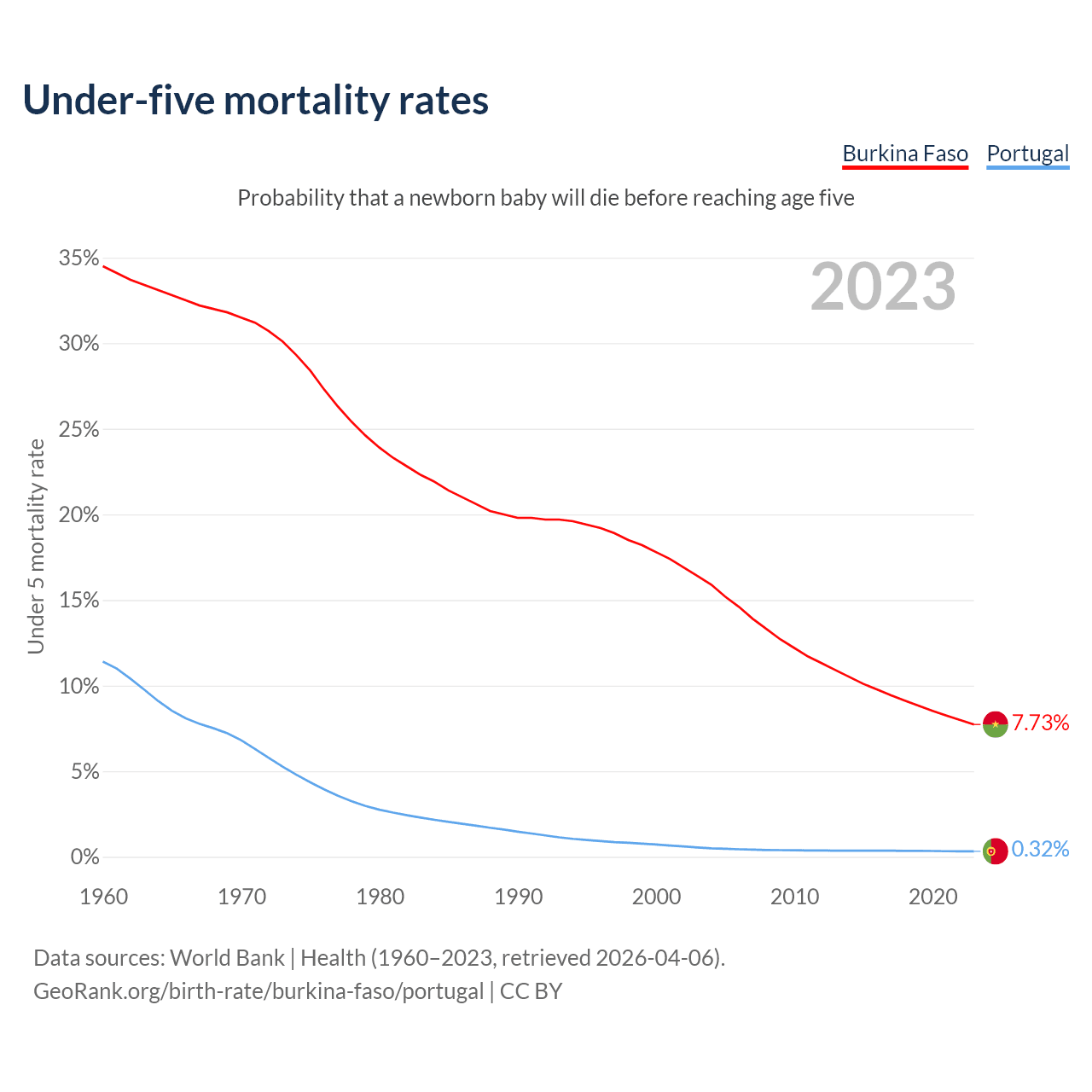 The chance that a newborn baby will die before reaching age five is 7.73% in Burkina Faso and 0.32% in Portugal. Above is a chart with historical data on under-five mortality rates.