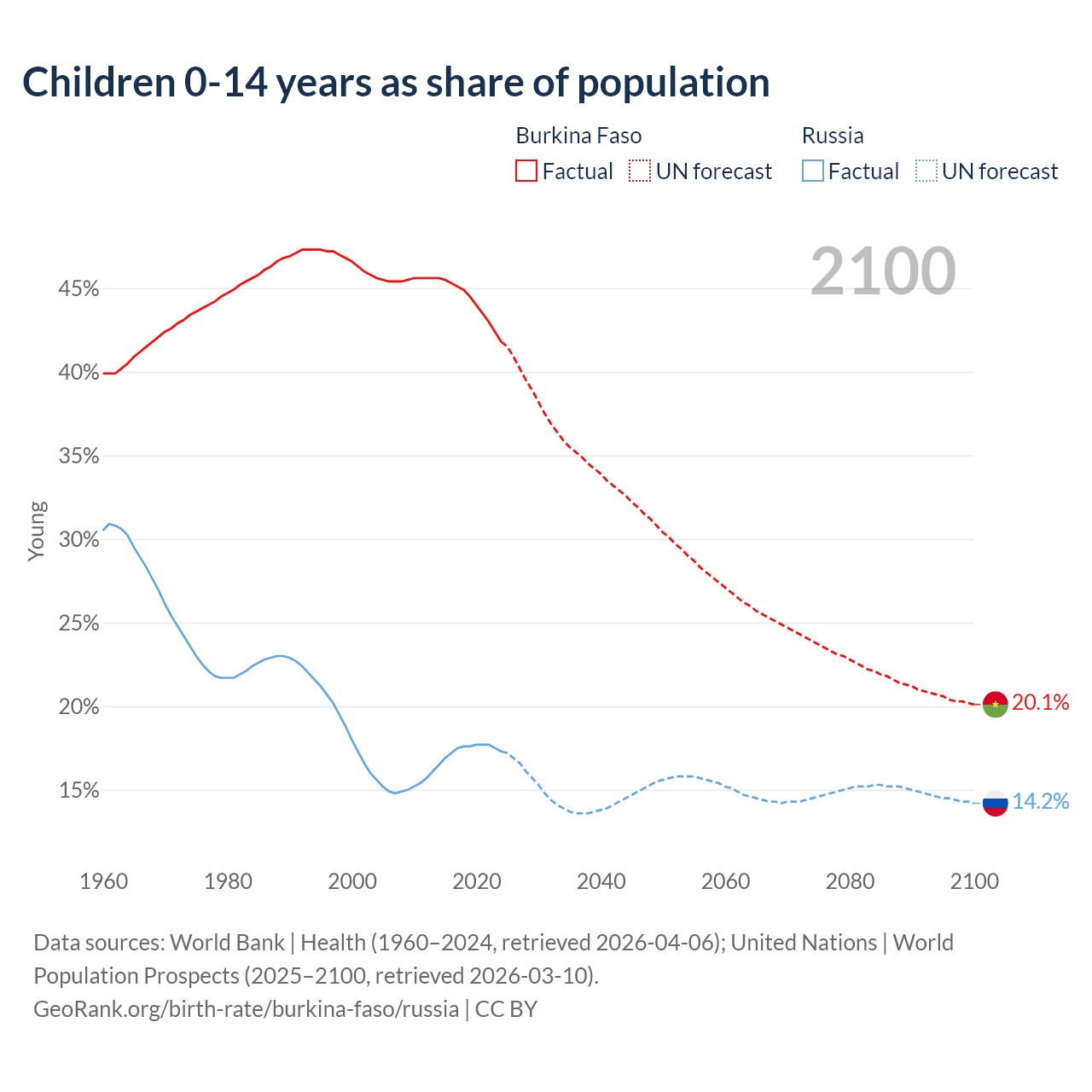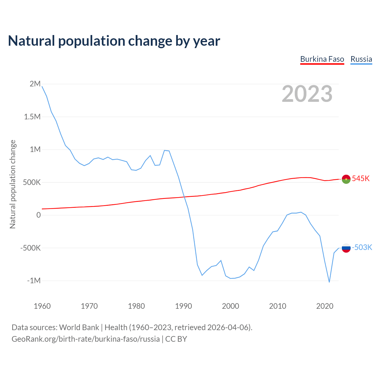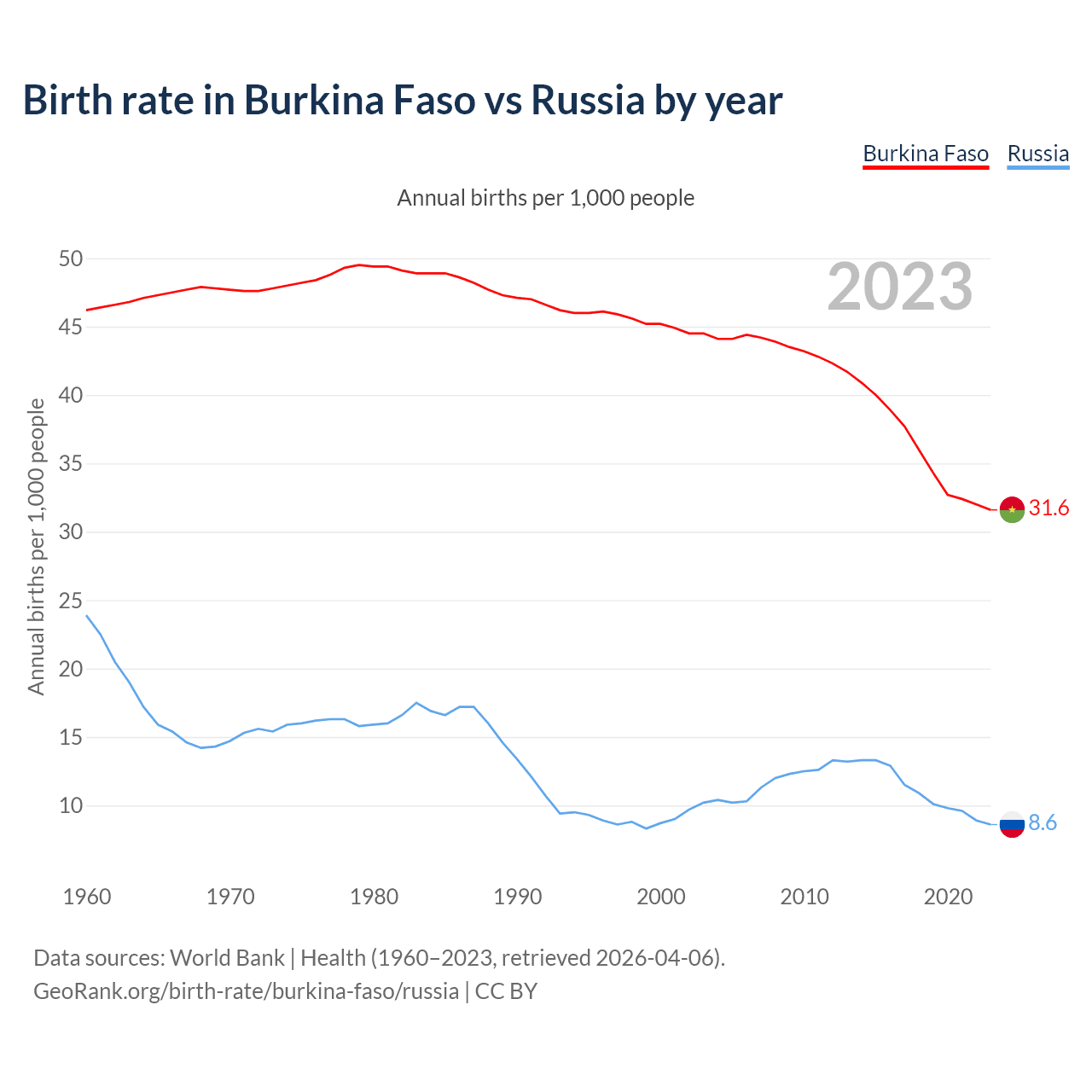 Burkina Faso has an annual birth rate of 31.6 births per 1,000 people, compared to 8.6 for Russia. The average number of children a woman is expected to have during her lifetime — the fertility rate, is 4.19 in Burkina Faso and 1.41 in Russia — 66.3% difference.
