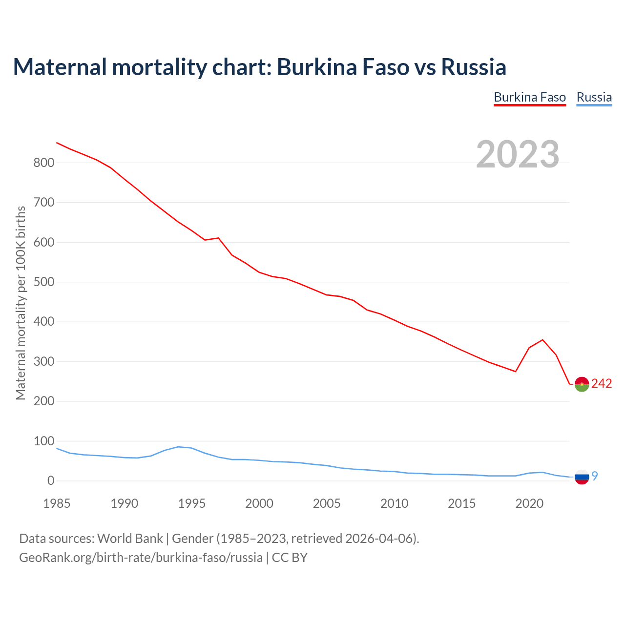 The maternal mortality rate, which is the probability of dying during childbirth or within 42 days of pregnancy termination, is 242 deaths per 100,000 live births in Burkina Faso, compared to 9 deaths in Russia.