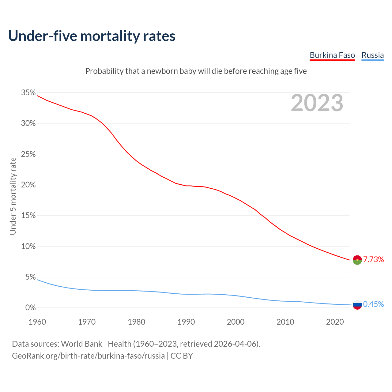 The chance that a newborn baby will die before reaching age five is 7.73% in Burkina Faso and 0.45% in Russia. Above is a chart with historical data on under-five mortality rates.