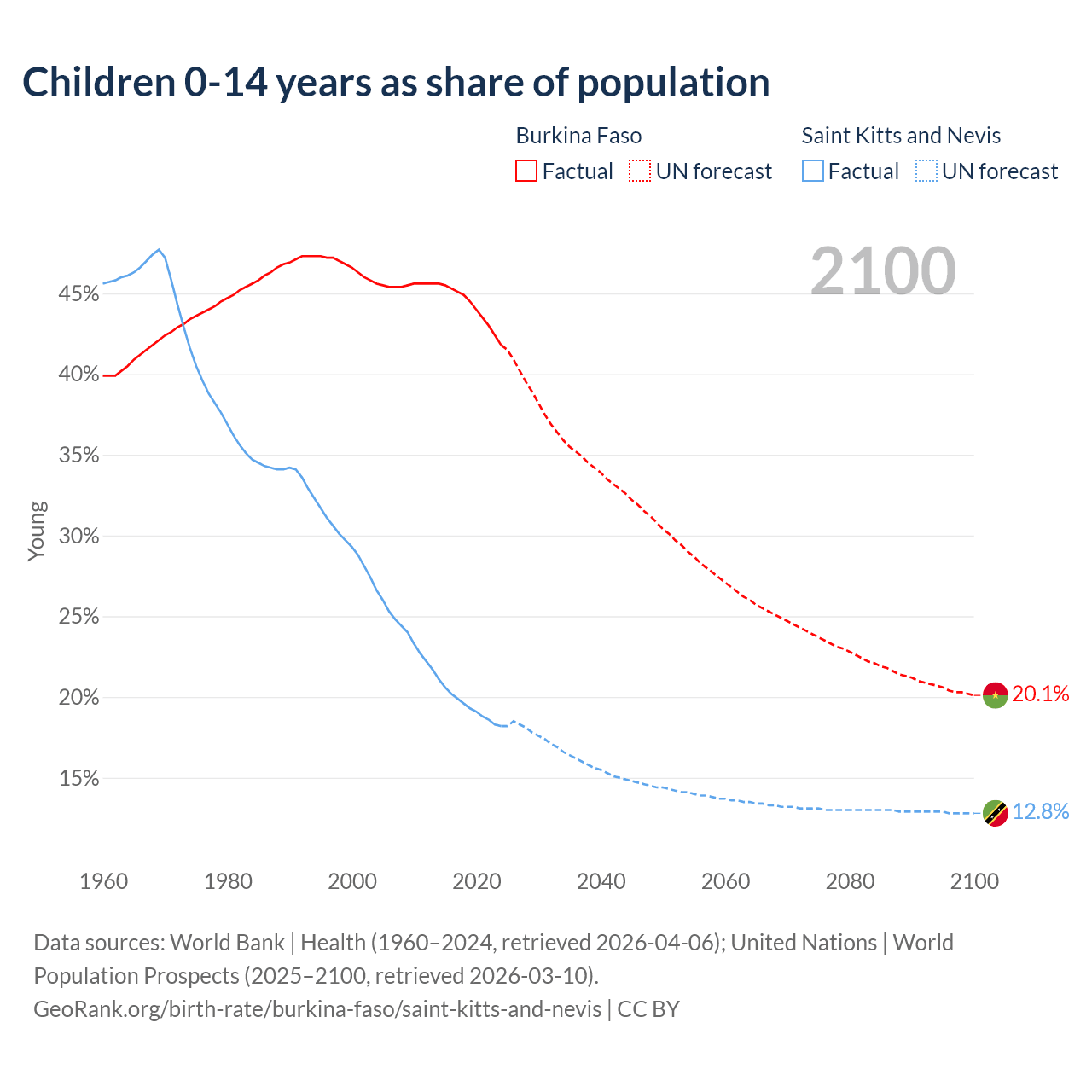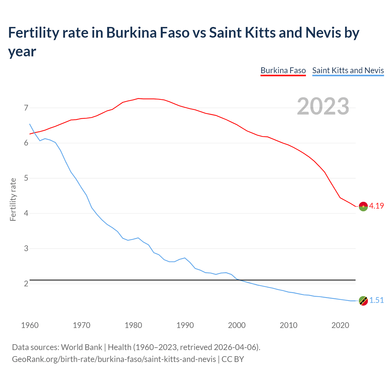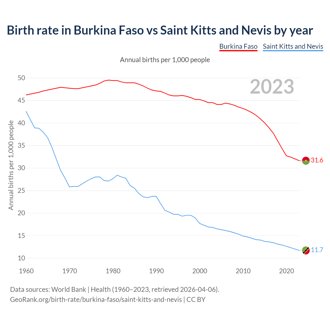 Burkina Faso has an annual birth rate of 31.6 births per 1,000 people, compared to 11.7 for Saint Kitts and Nevis. The average number of children a woman is expected to have during her lifetime — the fertility rate, is 4.19 in Burkina Faso and 1.51 in Saint Kitts and Nevis — 64% difference.