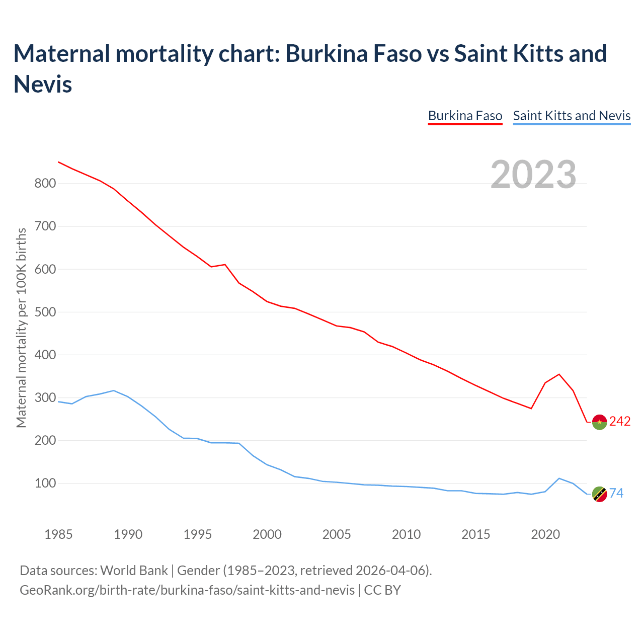 The maternal mortality rate, which is the probability of dying during childbirth or within 42 days of pregnancy termination, is 242 deaths per 100,000 live births in Burkina Faso, compared to 74 deaths in Saint Kitts and Nevis.