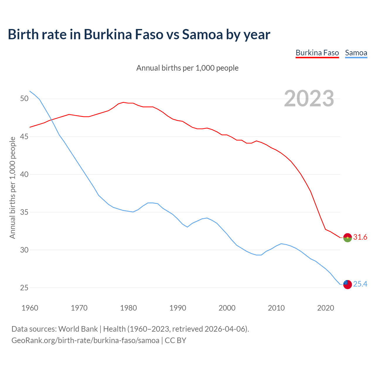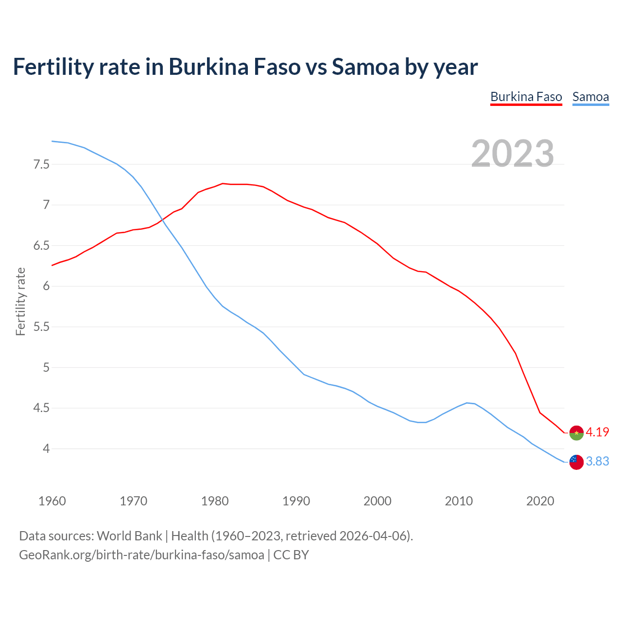 Burkina Faso has an annual birth rate of 31.6 births per 1,000 people, compared to 25.4 for Samoa. The average number of children a woman is expected to have during her lifetime — the fertility rate, is 4.19 in Burkina Faso and 3.83 in Samoa — 8.53% difference.