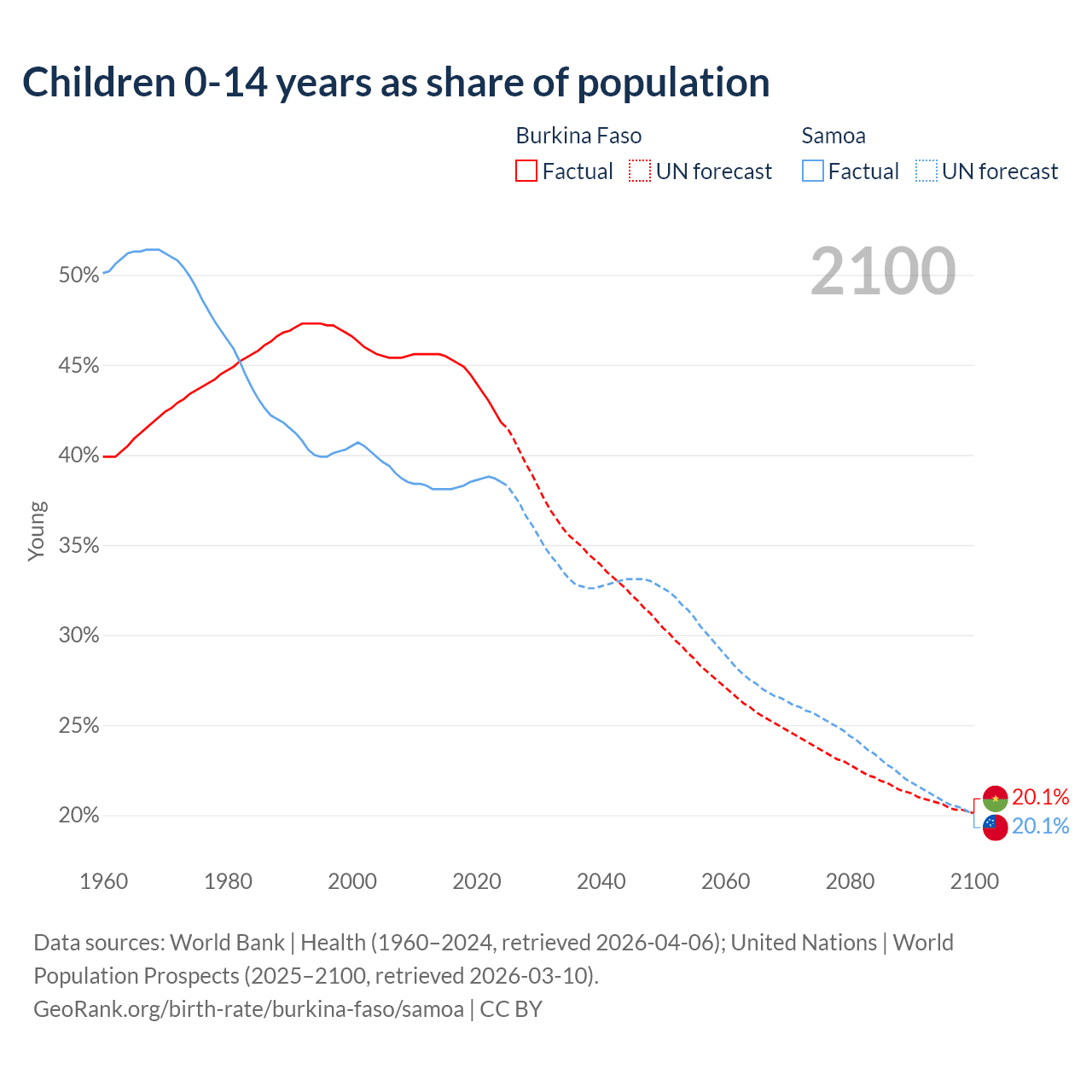 According to the latest available data on birth rates, the fertility rate in Burkina Faso was 4.19 children per woman in 2023, compared to 3.83 in Samoa in 2023. The replacement level is considered to be 2.1 children per woman.