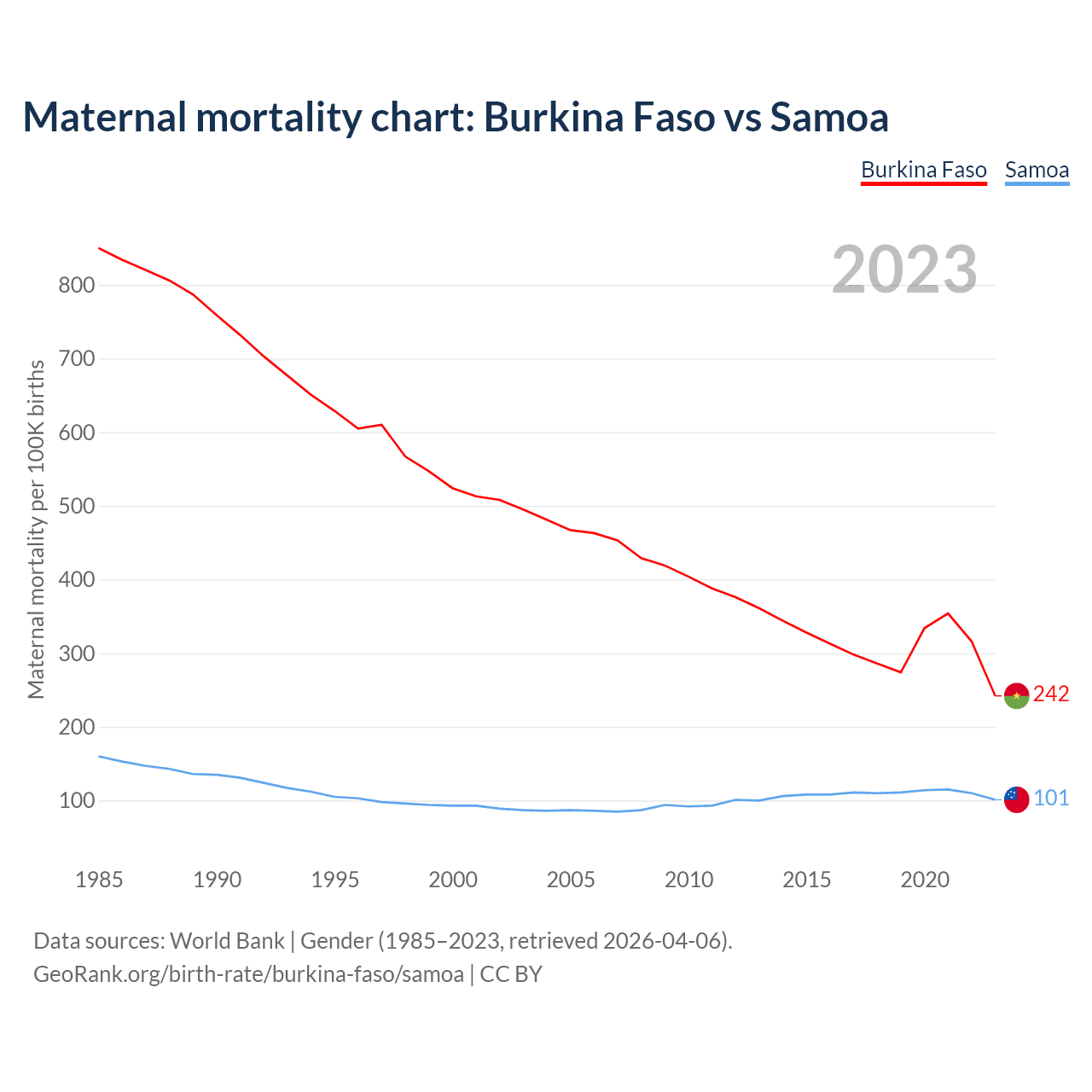 The maternal mortality rate, which is the probability of dying during childbirth or within 42 days of pregnancy termination, is 242 deaths per 100,000 live births in Burkina Faso, compared to 101 deaths in Samoa.