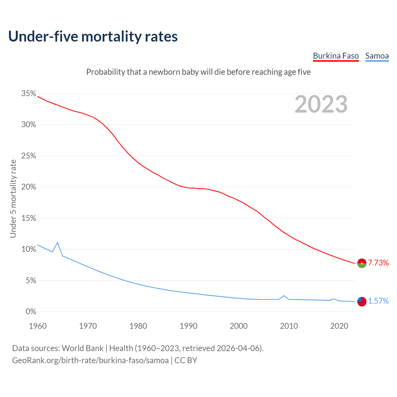 The chance that a newborn baby will die before reaching age five is 7.73% in Burkina Faso and 1.57% in Samoa. Above is a chart with historical data on under-five mortality rates.