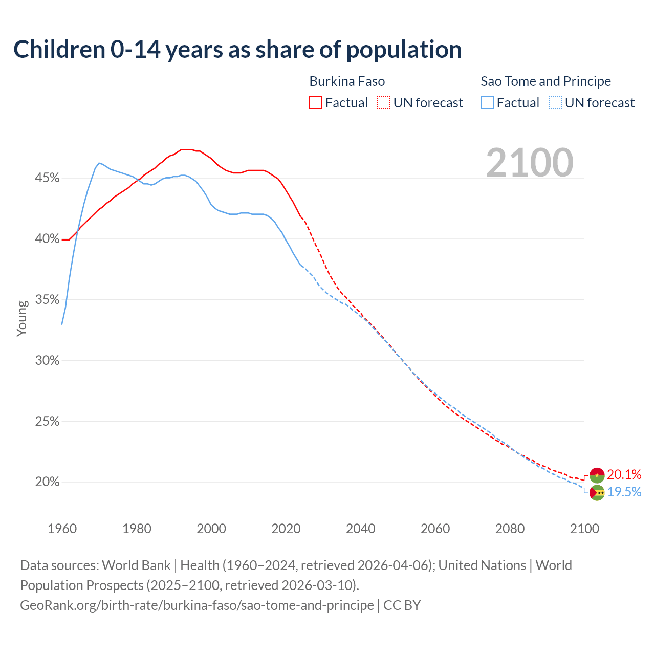 According to the latest available data on birth rates, the fertility rate in Burkina Faso was 4.19 children per woman in 2023, compared to 3.64 in Sao Tome and Principe in 2023. The replacement level is considered to be 2.1 children per woman.