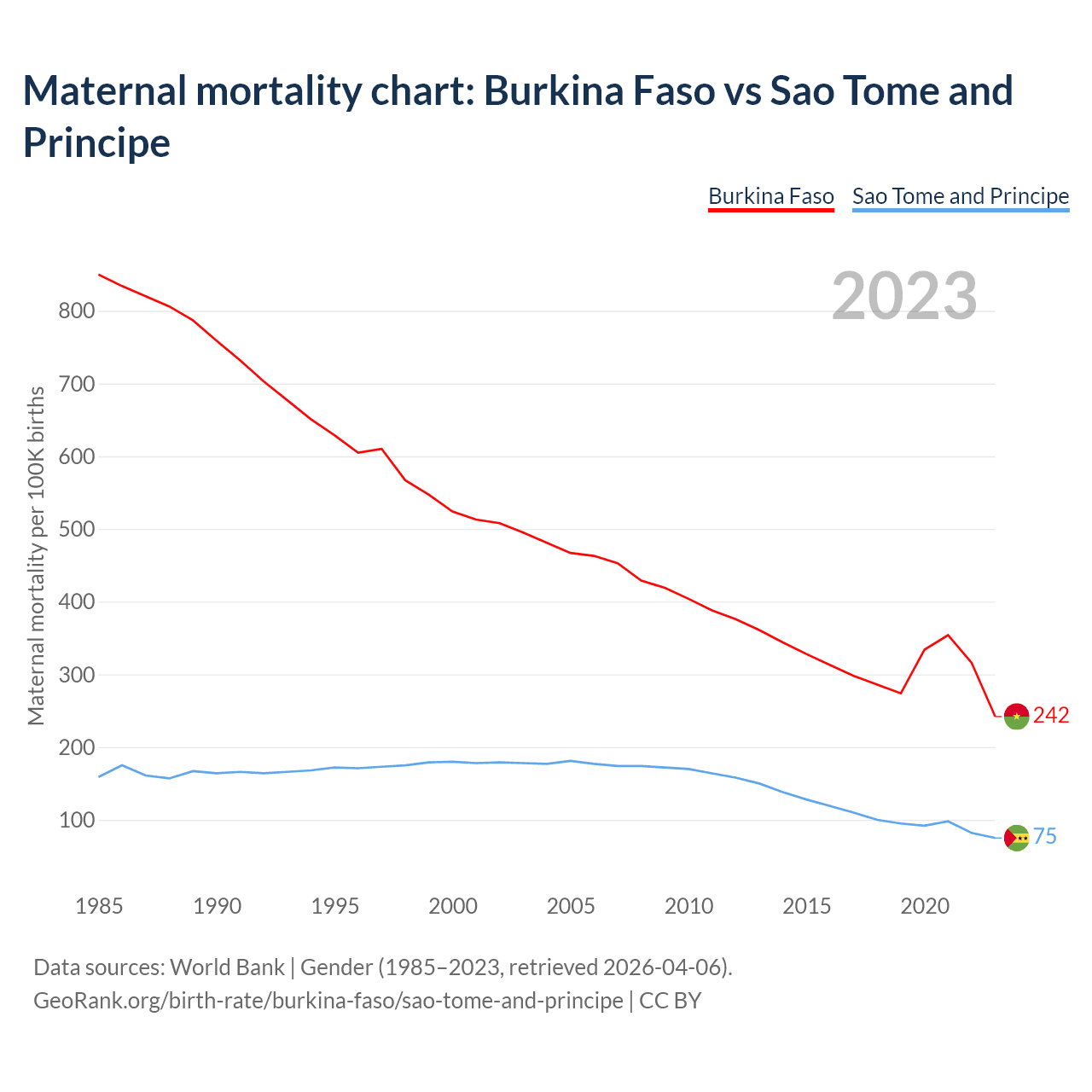 The maternal mortality rate, which is the probability of dying during childbirth or within 42 days of pregnancy termination, is 242 deaths per 100,000 live births in Burkina Faso, compared to 75 deaths in Sao Tome and Principe.