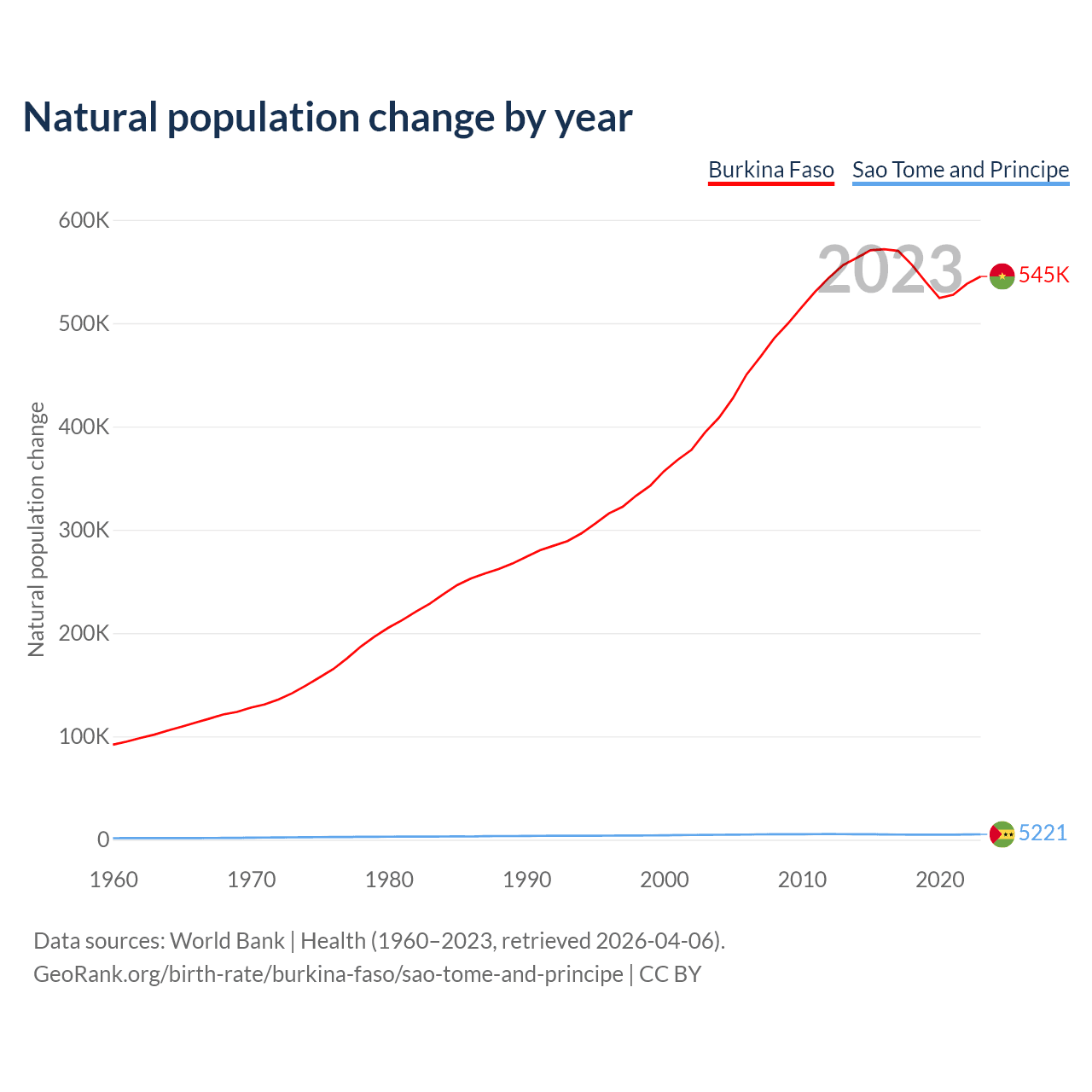 Check Burkina Faso vs Sao Tome and Principe population clock for a dynamic visualization of the changing population.