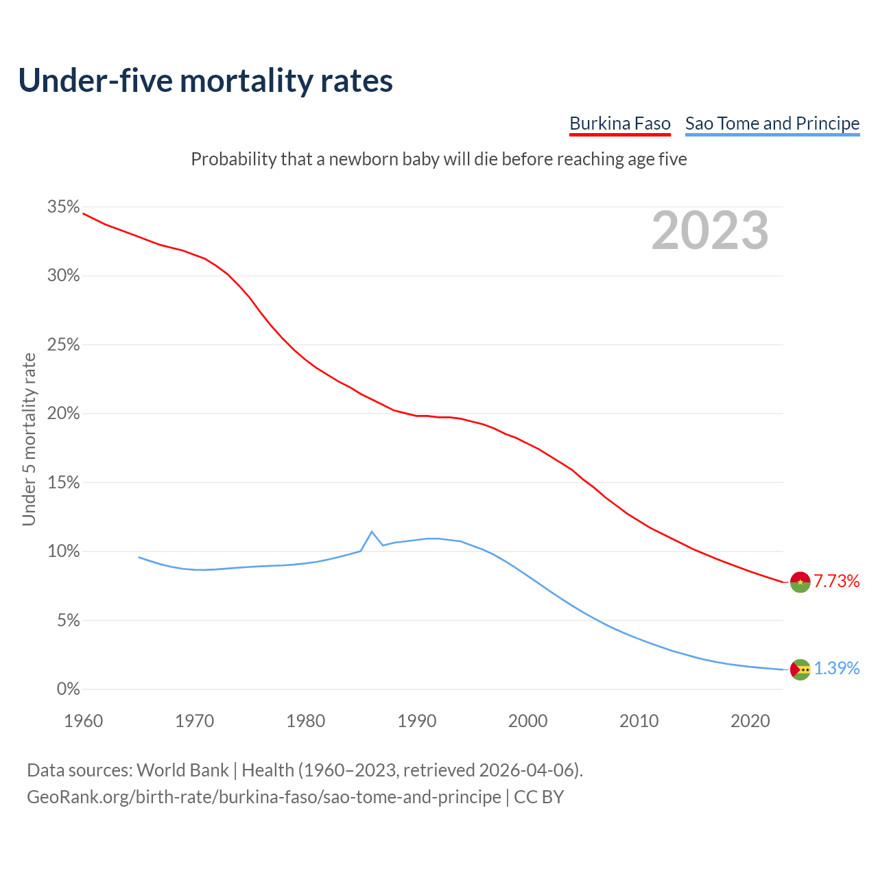The chance that a newborn baby will die before reaching age five is 7.73% in Burkina Faso and 1.39% in Sao Tome and Principe. Above is a chart with historical data on under-five mortality rates.