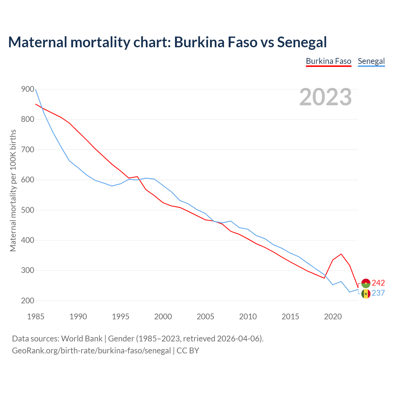 The maternal mortality rate, which is the probability of dying during childbirth or within 42 days of pregnancy termination, is 242 deaths per 100,000 live births in Burkina Faso, compared to 237 deaths in Senegal.