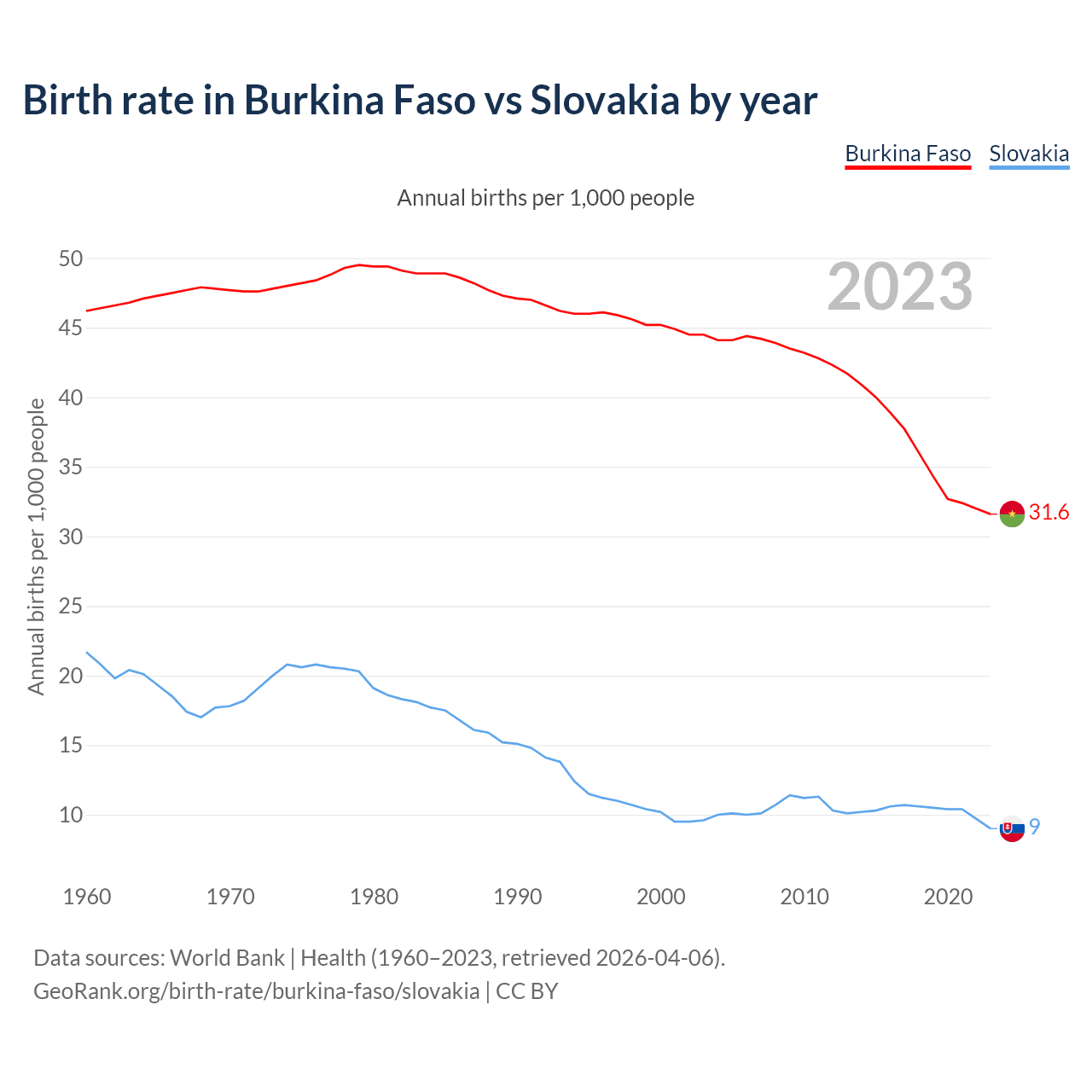 Burkina Faso has an annual birth rate of 31.6 births per 1,000 people, compared to 9 for Slovakia. The average number of children a woman is expected to have during her lifetime — the fertility rate, is 4.19 in Burkina Faso and 1.49 in Slovakia — 64.4% difference.