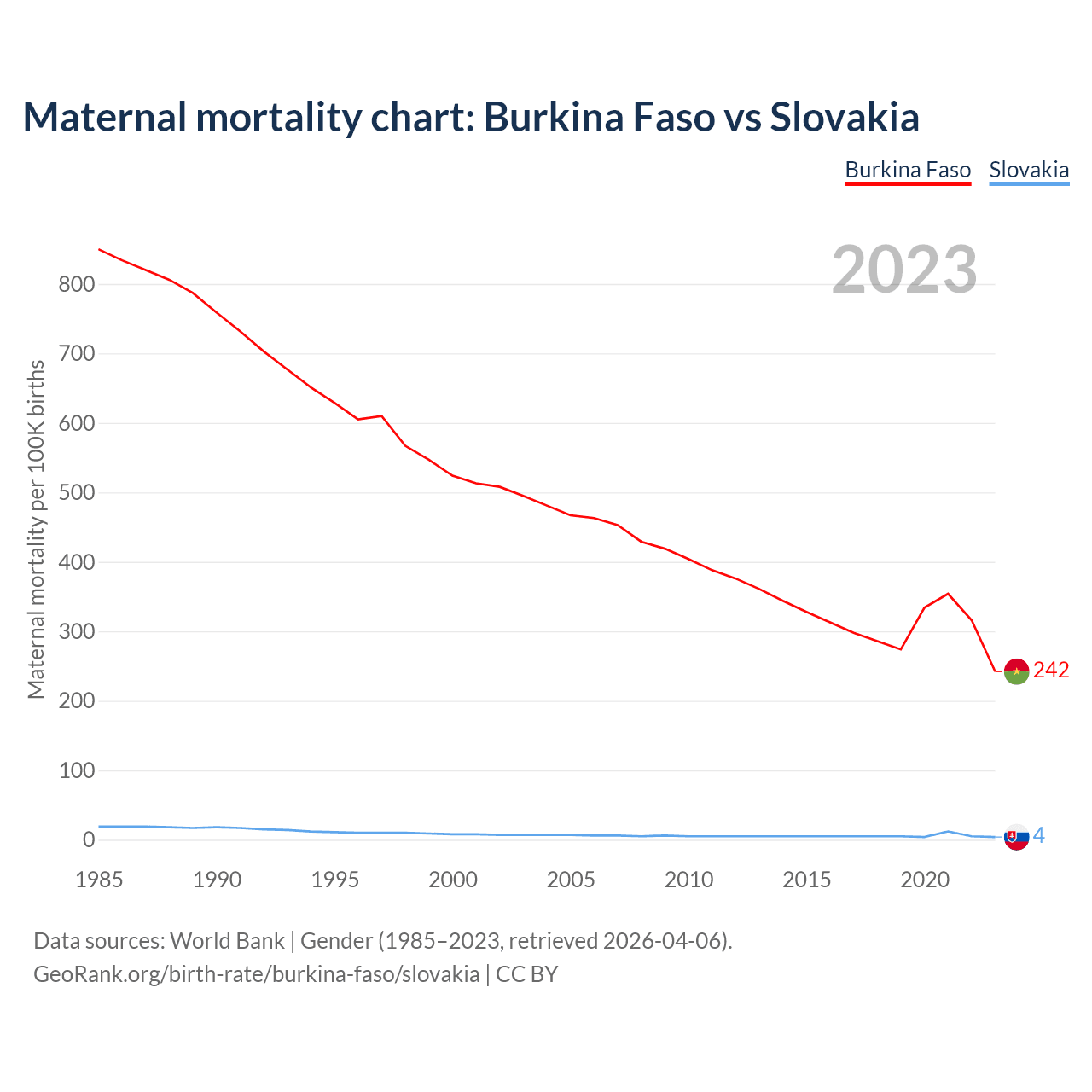 The maternal mortality rate, which is the probability of dying during childbirth or within 42 days of pregnancy termination, is 242 deaths per 100,000 live births in Burkina Faso, compared to 4 deaths in Slovakia.