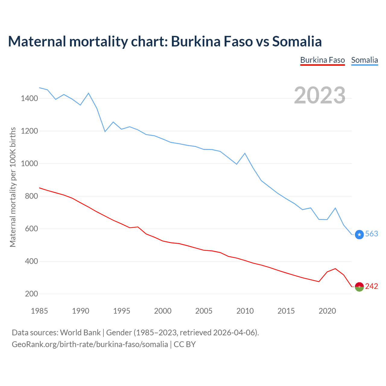 The maternal mortality rate, which is the probability of dying during childbirth or within 42 days of pregnancy termination, is 242 deaths per 100,000 live births in Burkina Faso, compared to 563 deaths in Somalia.