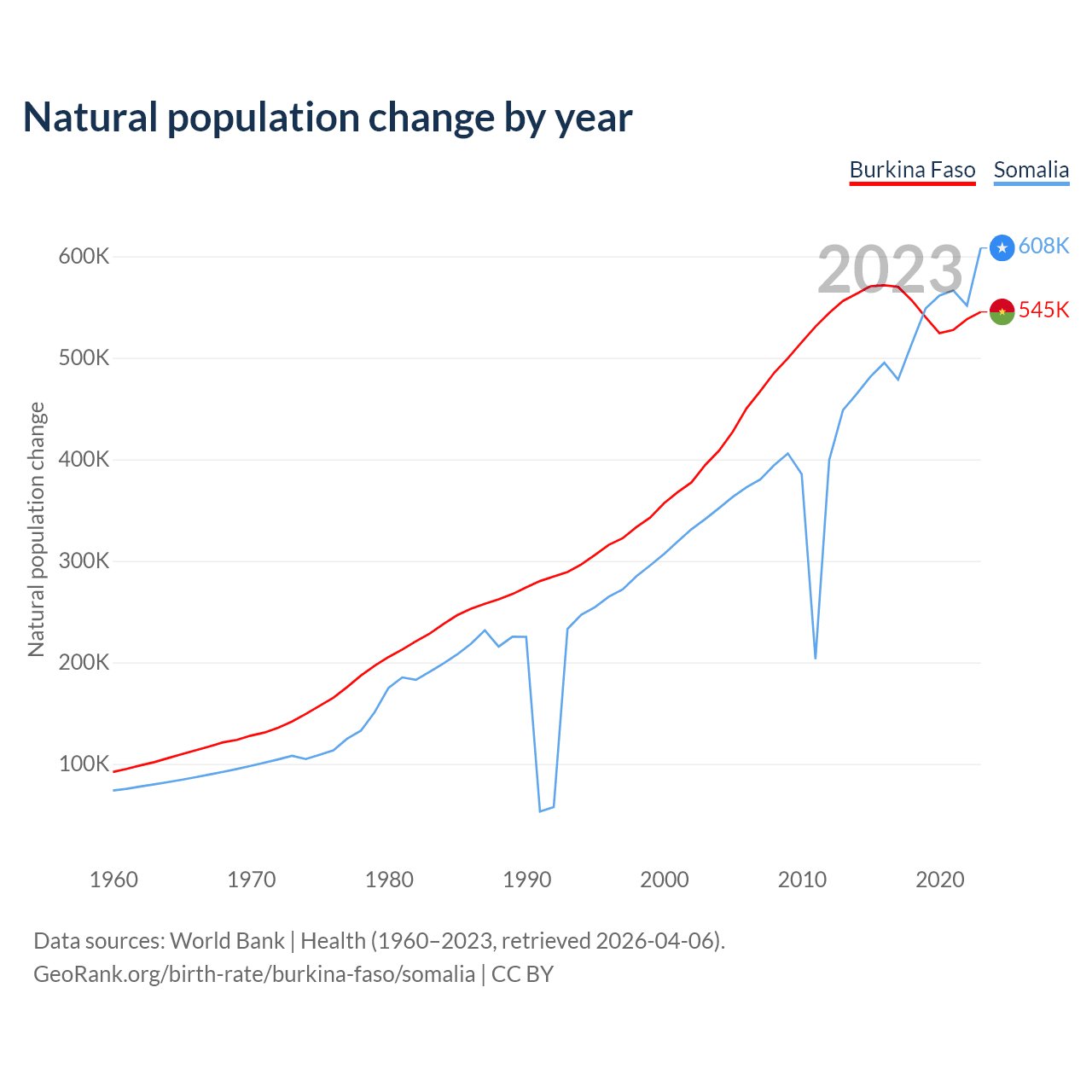 Burkina Faso has an annual birth rate of 31.6 births per 1,000 people, compared to 43 for Somalia. The average number of children a woman is expected to have during her lifetime — the fertility rate, is 4.19 in Burkina Faso and 6.13 in Somalia — 46.5% difference.