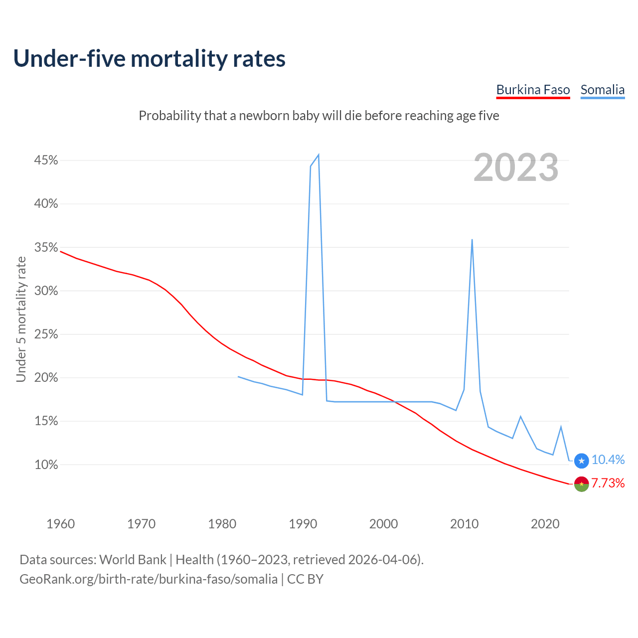 The chance that a newborn baby will die before reaching age five is 7.73% in Burkina Faso and 10.4% in Somalia. Above is a chart with historical data on under-five mortality rates.