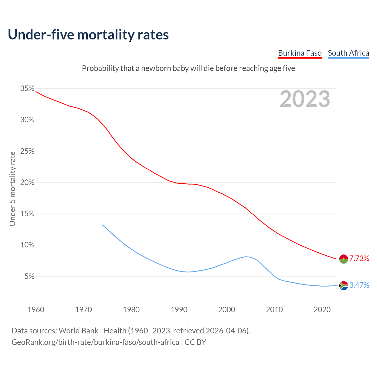 The chance that a newborn baby will die before reaching age five is 7.73% in Burkina Faso and 3.47% in South Africa. Above is a chart with historical data on under-five mortality rates.