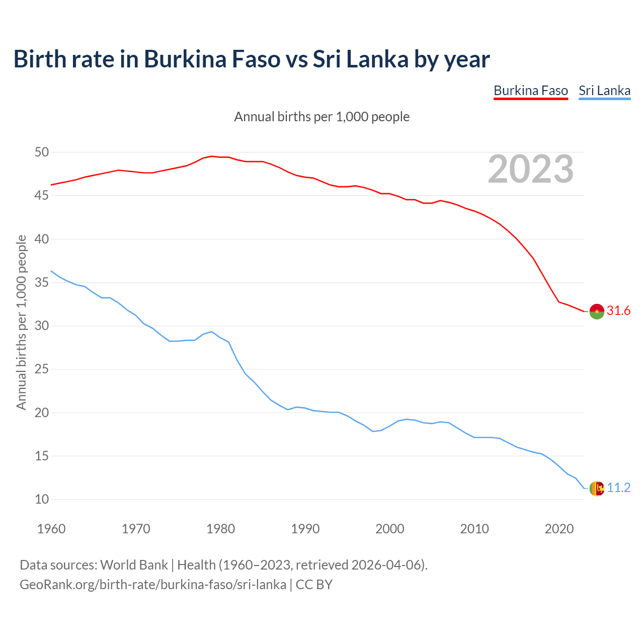 Burkina Faso has an annual birth rate of 31.6 births per 1,000 people, compared to 11.2 for Sri Lanka. The average number of children a woman is expected to have during her lifetime — the fertility rate, is 4.19 in Burkina Faso and 1.97 in Sri Lanka — 52.8% difference.