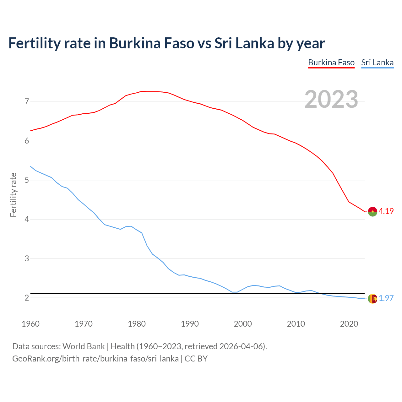 According to the latest available data on birth rates, the fertility rate in Burkina Faso was 4.19 children per woman in 2023, compared to 1.97 in Sri Lanka in 2023. The replacement level is considered to be 2.1 children per woman.