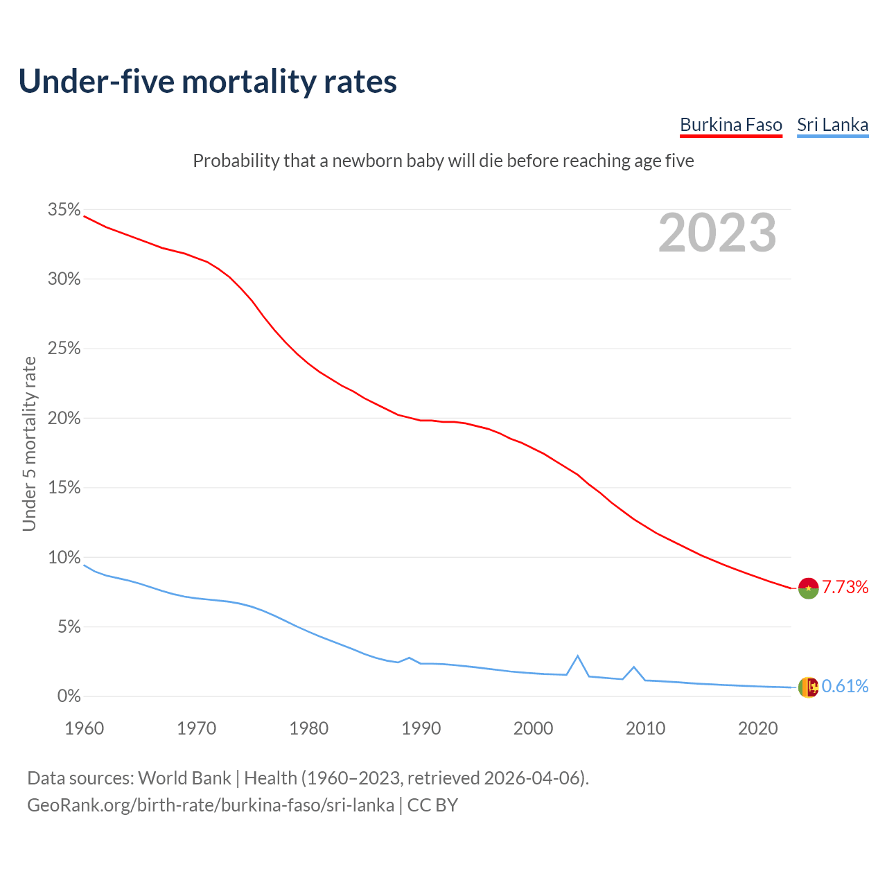 The chance that a newborn baby will die before reaching age five is 7.73% in Burkina Faso and 0.61% in Sri Lanka. Above is a chart with historical data on under-five mortality rates.