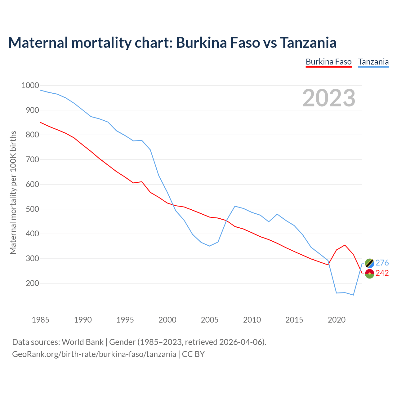 The maternal mortality rate, which is the probability of dying during childbirth or within 42 days of pregnancy termination, is 242 deaths per 100,000 live births in Burkina Faso, compared to 276 deaths in Tanzania.