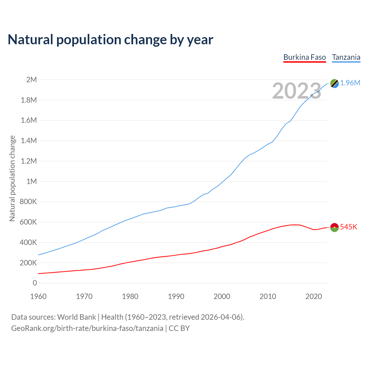 Check Burkina Faso vs Tanzania population clock for a dynamic visualization of the changing population.