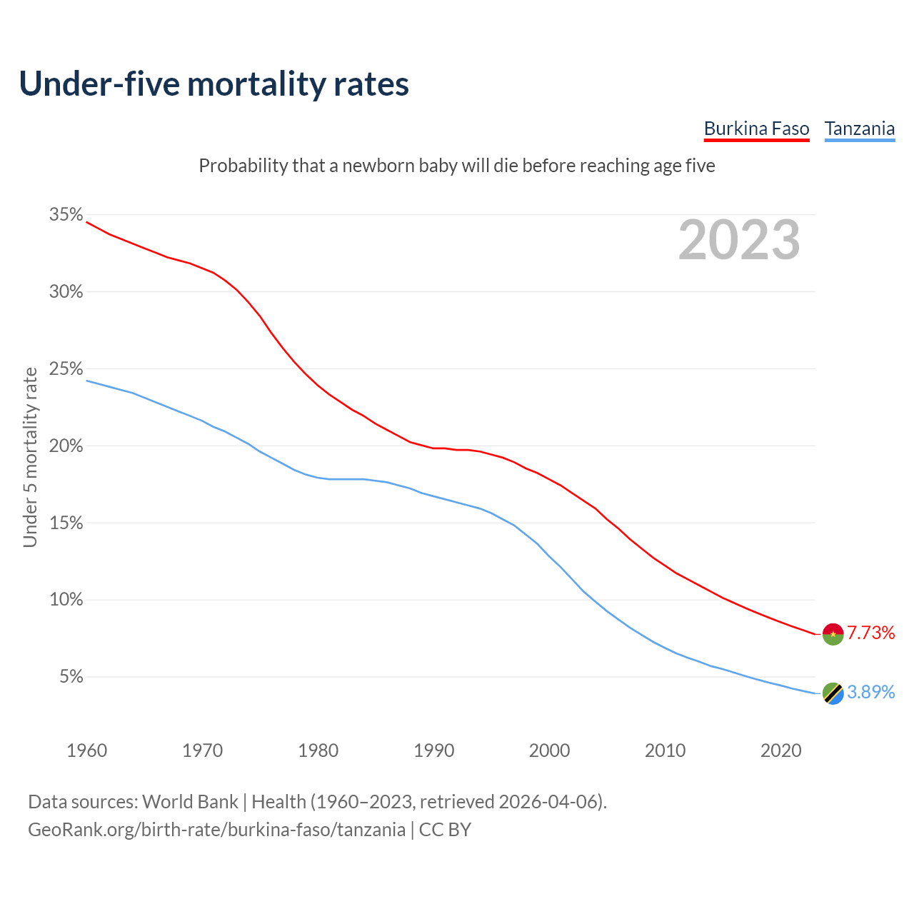 The chance that a newborn baby will die before reaching age five is 7.73% in Burkina Faso and 3.89% in Tanzania. Above is a chart with historical data on under-five mortality rates.